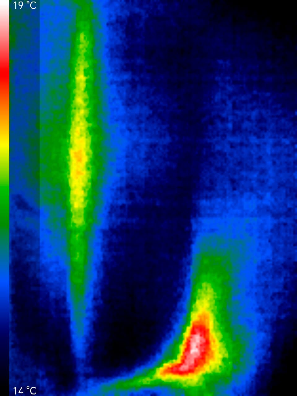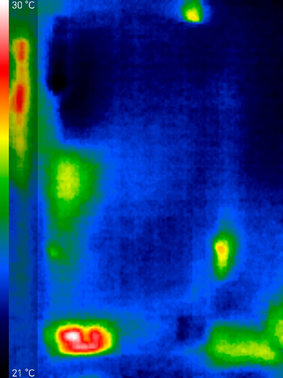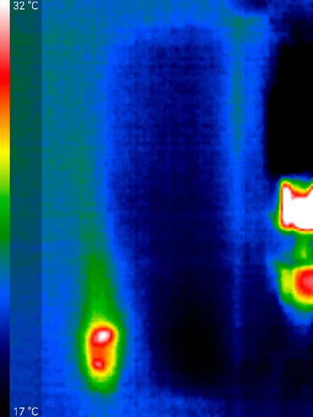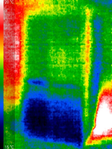 На всех фото ярко выделяется место размещения испарителя и компрессора (и даже некий небольшой шлейф нагретого воздуха), но при этом максимальная присутствующая на изображениях температура — 32 °C. Это свидетельствует о неплохой теплоизоляции самого прибора и относительно низком тепловыделении. За счет того, что все тепловыделяющие элементы сосредоточены в одном месте, стенки холодильника вообще не нагреваются.
