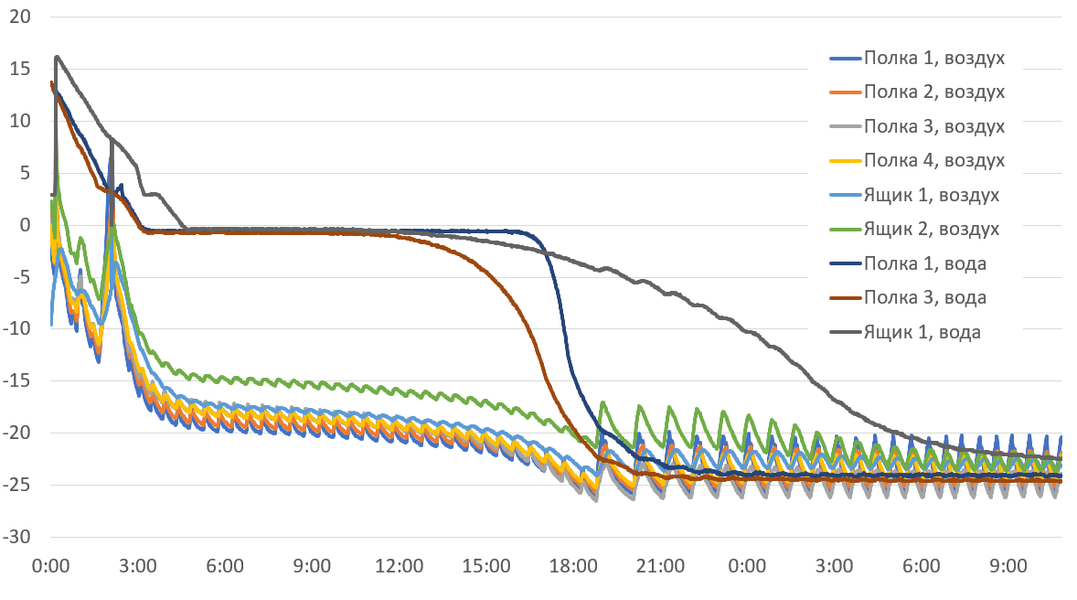 Чтобы оценить замораживающую способность холодильника, мы поместили по контейнеру с водой комнатной температуры на первую и четвертую полки морозильной камеры, третий контейнер разместили в верхнем ящике, после чего включили режим максимального охлаждения. Результаты измерений температуры воды и воздуха можно видеть на графике ниже.