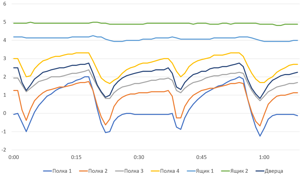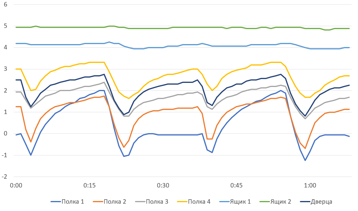 На графике можно видеть, что во всех точках измерения температура колеблется в относительно широких пределах, понижаясь при включении компрессора и плавно повышаясь после его отключения.