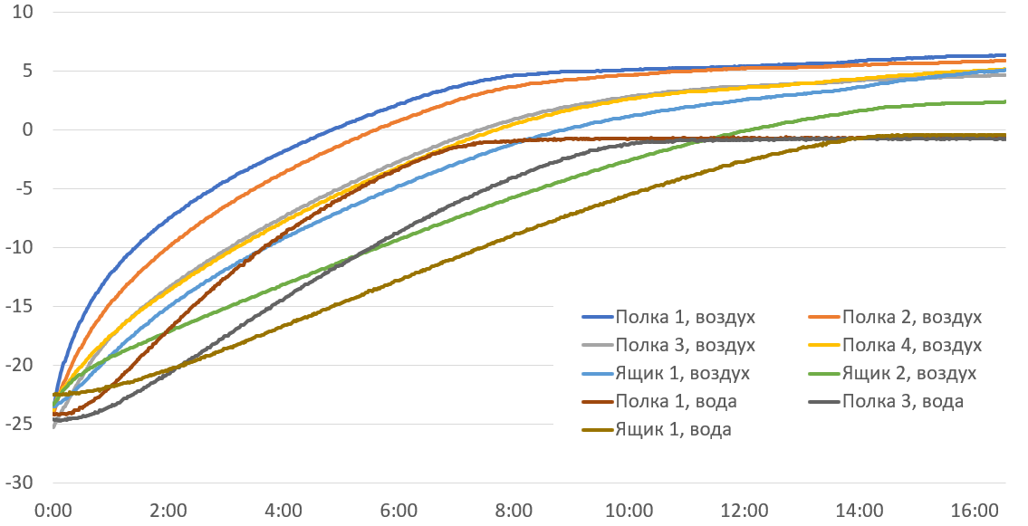 Чтобы оценить теплоизоляцию корпуса и понять, как долго удерживает холод отключенное от сети устройство, мы выключили предварительно охлажденный прибор с балластом и понаблюдали за изменением температуры.