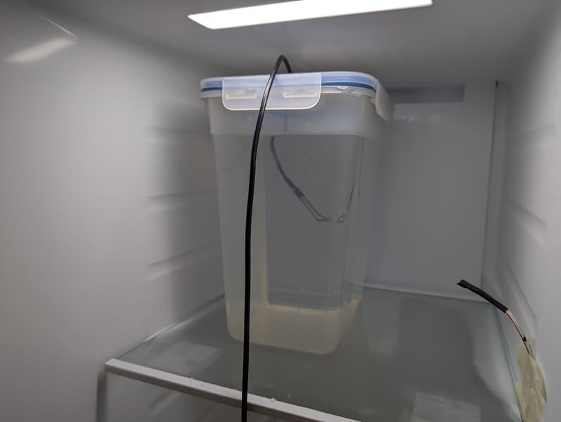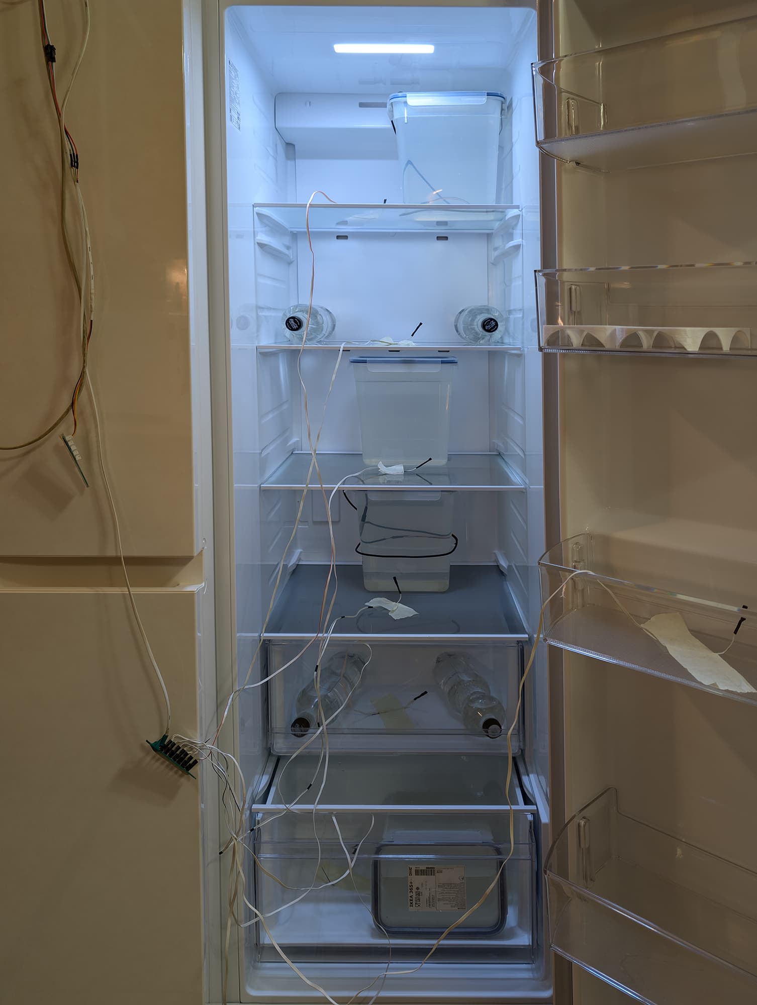 Помимо датчиков температуры воды, использовались датчики температуры воздуха. Их мы поместили рядом с контейнерами в те же ящики — так, чтобы поверхность сенсоров не контактировала напрямую с элементами корпуса морозильной камеры.