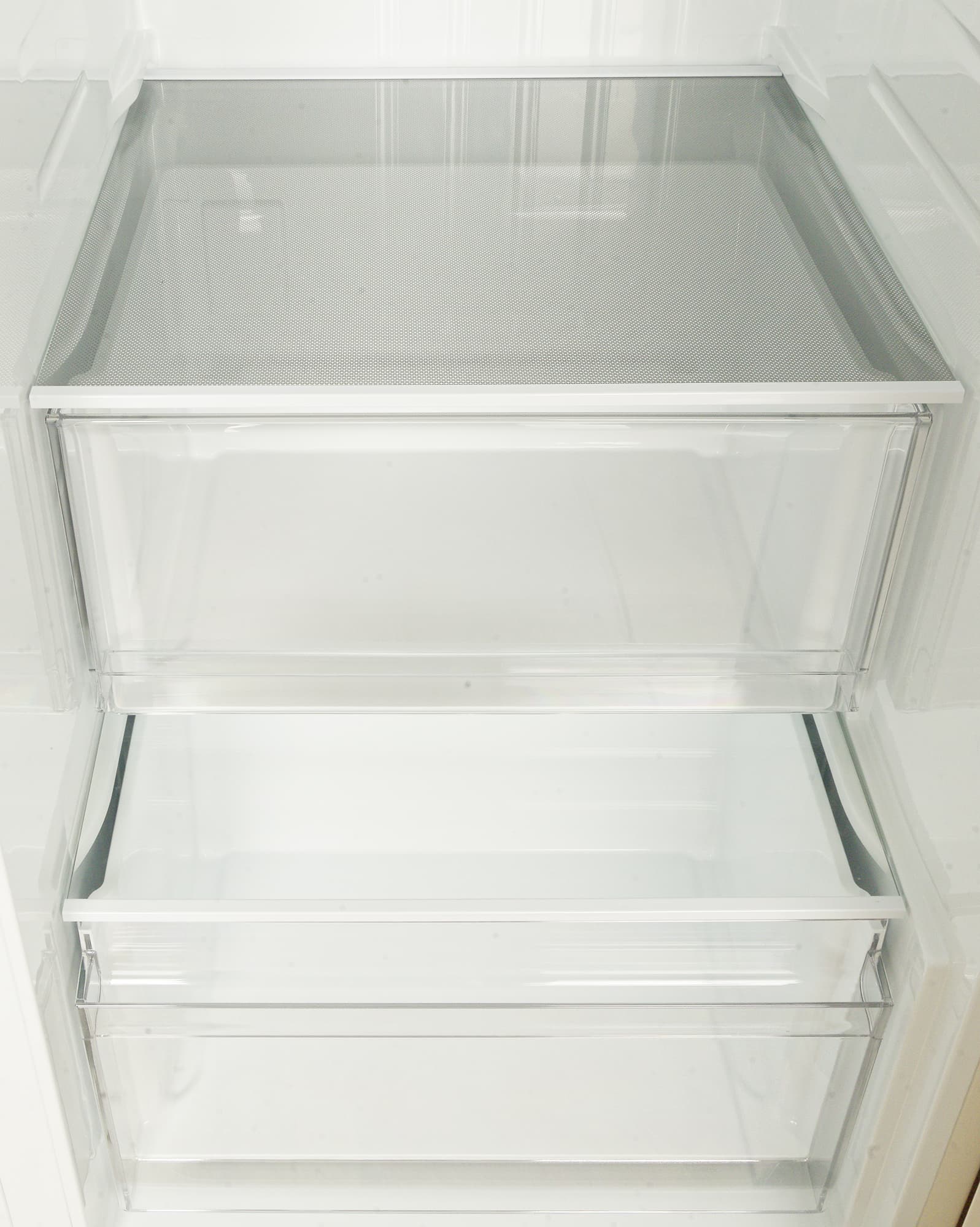 Для хранения овощей и фруктов в этой модели предусмотрены два ящика: верхний побольше, нижний — поменьше. Оба контейнера закрываются выдвижными стеклянными полками, обеспечивающими более ровный микроклимат.