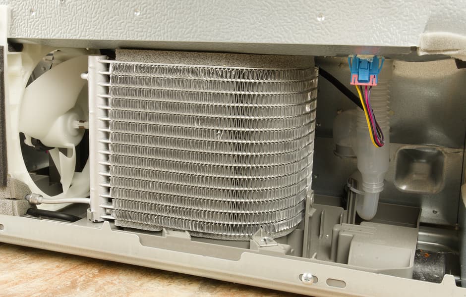 Змеевик теплообменника снабжен металлическими ребрами, улучшающими энергоэффективность конструкции. Под ним расположена пластиковая ванночка для сбора конденсата. Для улучшения теплообмена между отсеками компрессора и конденсатора размещен вентилятор.