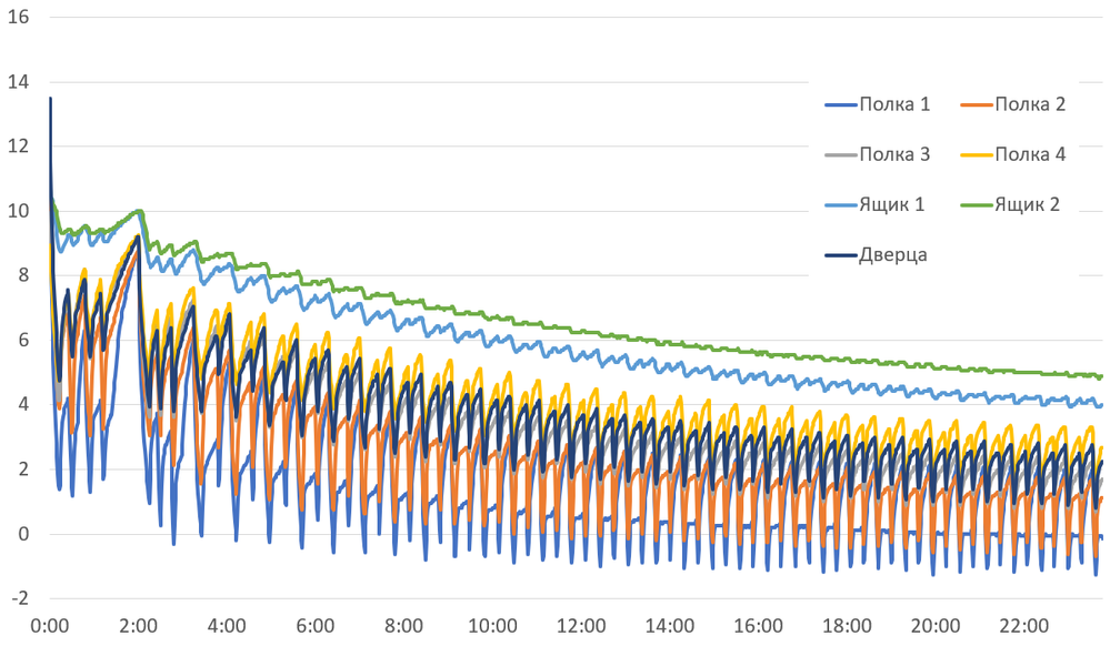 Считаем необходимым еще раз подчеркнуть, что приведенные графики иллюстрируют не потребительские качества холодильника, а особенности логики работы холодильного агрегата и циркуляции холодного воздуха между зонами камеры. Не следует удивляться таким, на первый взгляд, существенным колебаниям: охлажденные продукты обладают значительно большей тепловой инерцией, нежели воздух в камере, и переносят циклические изменения температуры нормально.