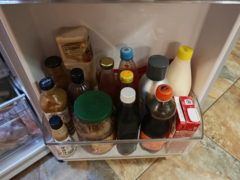 На дверной полке холодильного отделения помещается очень много всего.