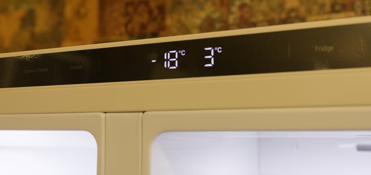 Забавная особенность организации панели управления состоит в том, что для выставления желательной температуры в морозильном отделении вам придется открыть обе дверцы, поскольку дверца морозильного отделения закрывает соответствующую кнопку, а холодильного — цифровой индикатор температуры. А вот чтобы посмотреть обе температуры, достаточно открыть холодильник.