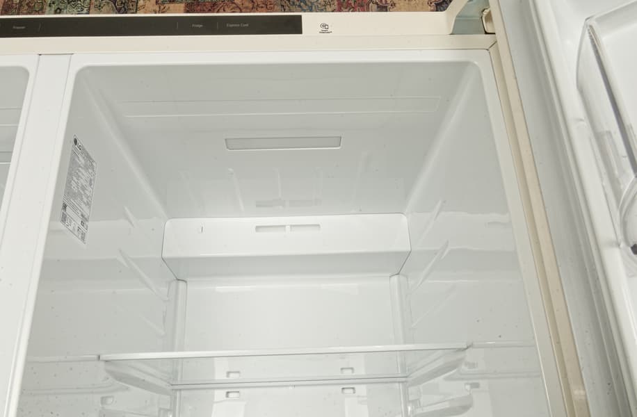 На потолке холодильного отделения вровень с поверхностью размещен прямоугольный модуль LED-подсветки, дающий ровный свет холодного спектра. На задней стенке мы видим вентиляционные отверстия, обеспечивающие работу системы NoFrost.