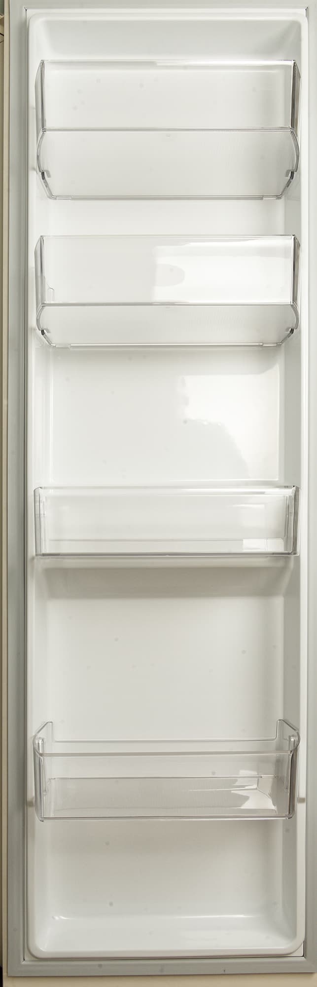 Дверца морозилки оборудована четырьмя съемными пластиковыми полками. У двух нижних фиксированное расположение, а верхние можно переставить повыше или пониже: здесь предусмотрено дополнительное крепление.
