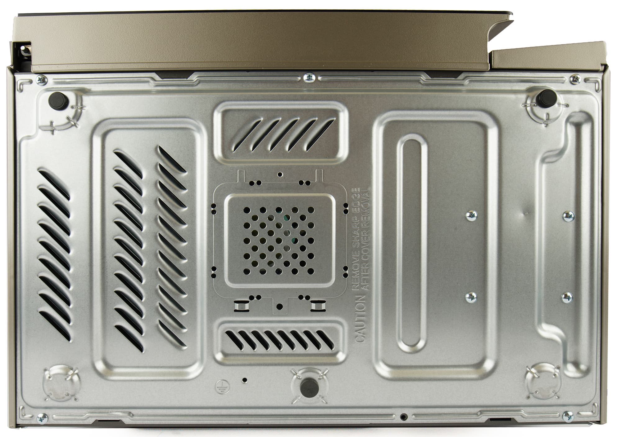На тыльной стороне — дополнительные вентиляционные отверстия и наклейка с информацией о приборе. Электропровод выходит из левого верхнего угла задней панели, он защищен от перегиба ограничителем. Справа — предохранительный упор, не позволяющий придвинуть устройство слишком близко к стене и повредить его или поверхность.