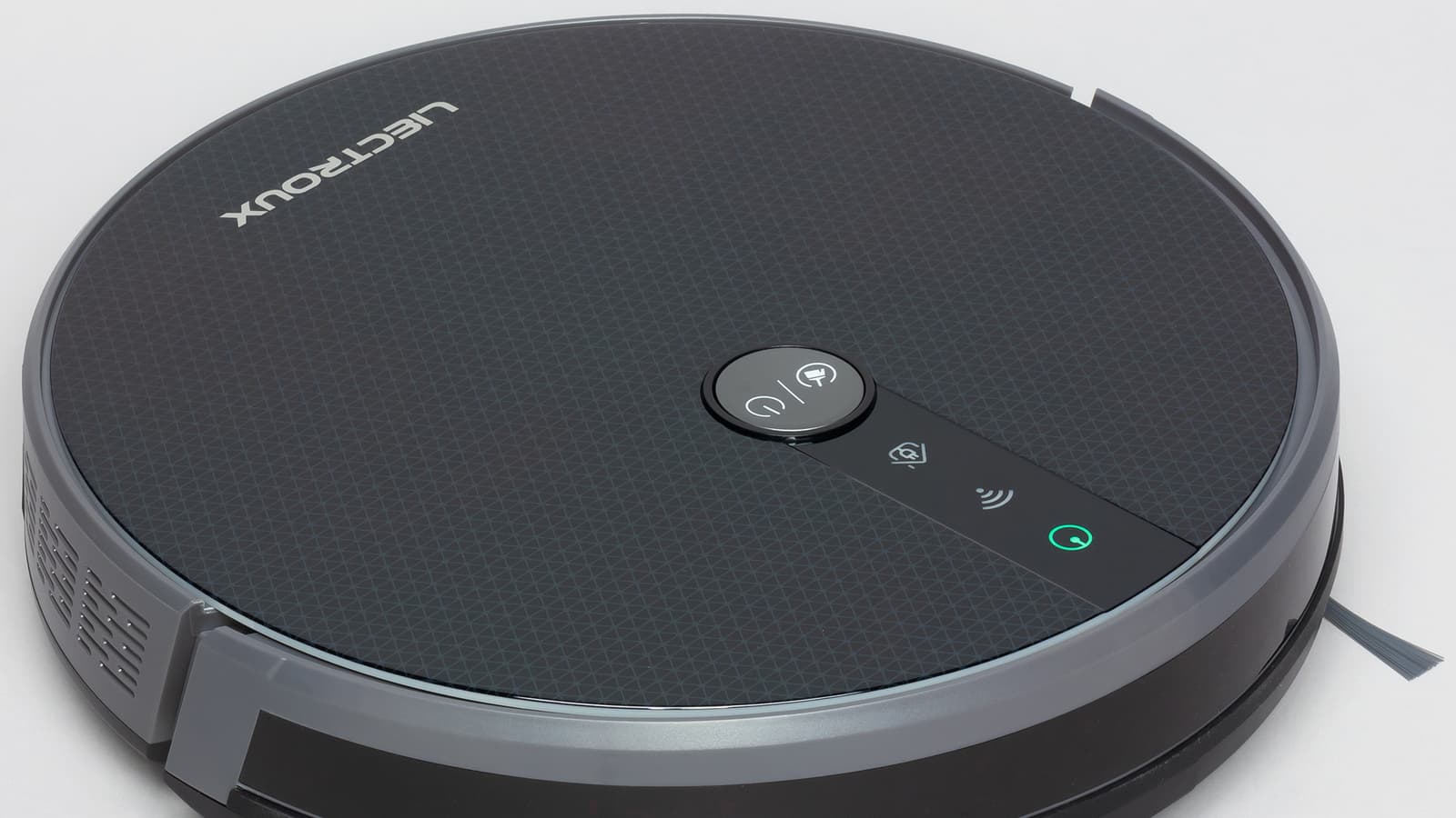 Верхняя панель ламинирована прозрачной пленкой, относительно устойчивой к царапинам. Пленка прикрывает геометрических узор и серебристый логотип. Преимущественно темный цвет корпуса осложняет поиск робота в темных закоулках квартиры, когда он по какой-то причине не вернется на базу, также робота сложнее заметить боковым зрением, когда он путается под ногами, а значит, с большей вероятностью на него можно наступить. На верхней панели чуть ближе к передней части есть одна механическая кнопка отвечающая за запуск/остановку уборки, включение/выключение робота и за включение режима подключения к Wi-Fi. Перед кнопкой есть значки трех индикаторов состояния. В зависимости от текущего состояния они светятся или мигают зеленым, оранжевым или красным. Яркость индикаторов достаточно высокая, чтобы рассмотреть их в освещенном помещении.