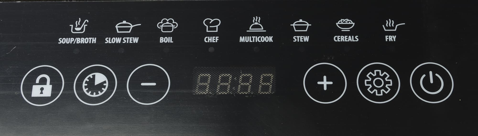 Она снабжена широкой панелью с крупными, быстро и четко срабатывающими сенсорами, предлагает 8 режимов работы с возможностью выбора 8 уровней нагрева в достаточном диапазоне для приготовления любых блюд. Кроме того эта модель оснащена функцией блокировки панели, а в некоторых режимах можно активировать таймер или отложенный старт.