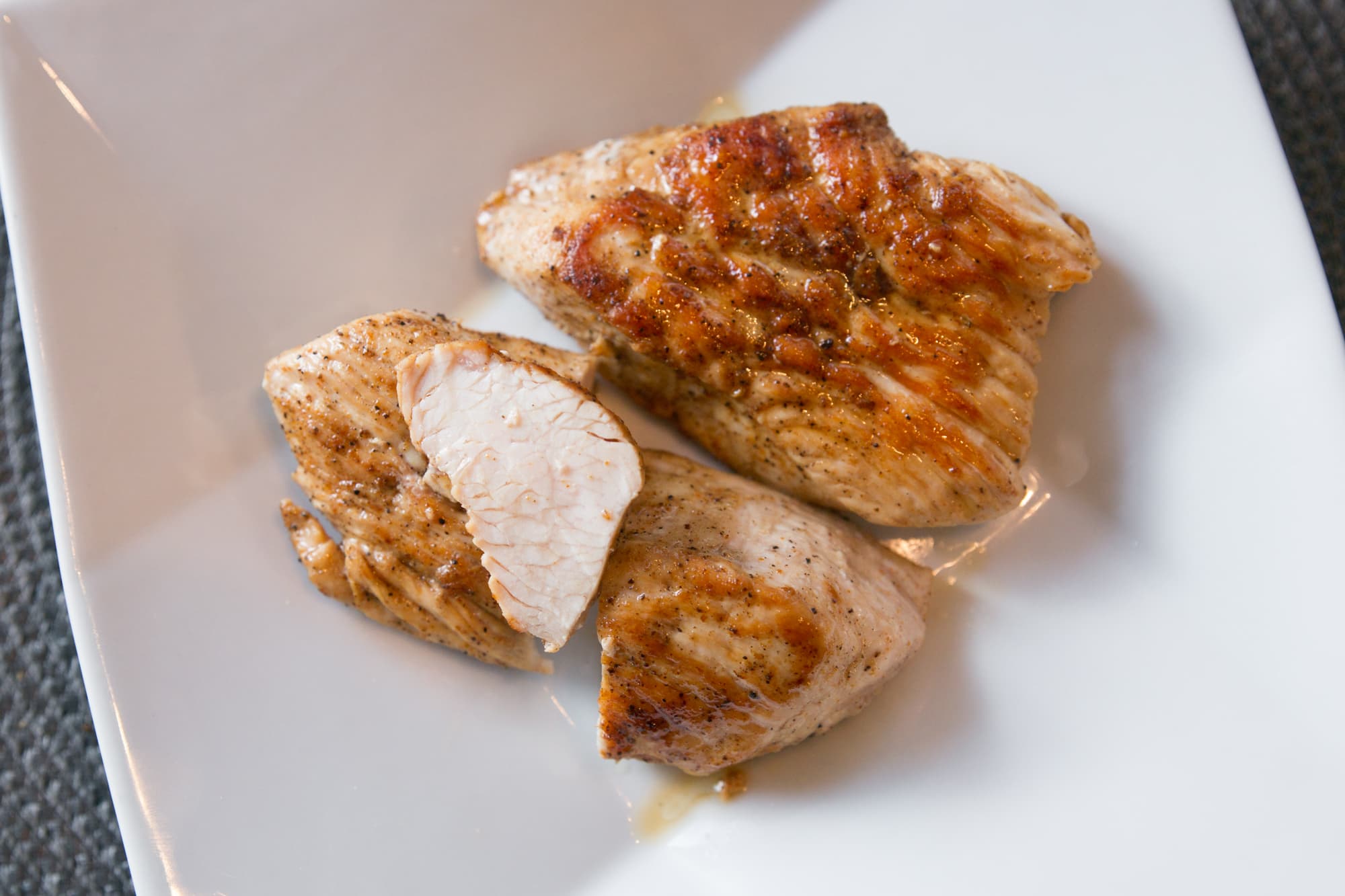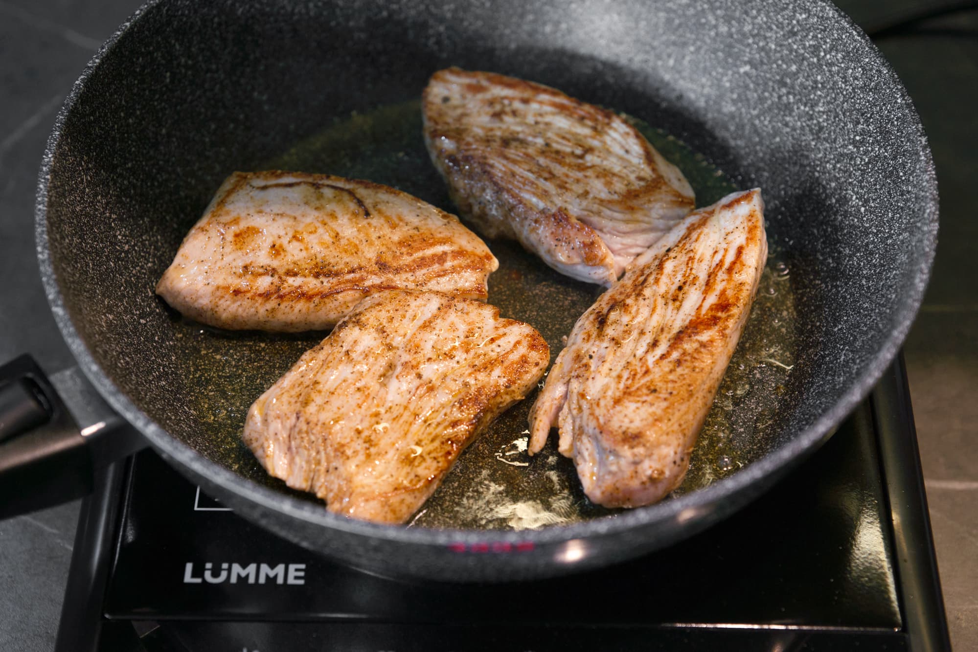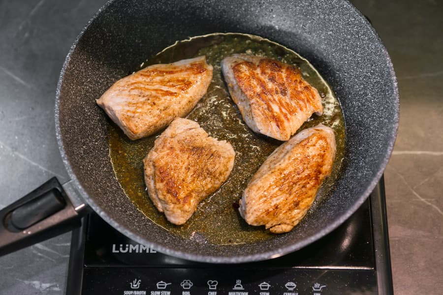Четыре куска индейки смазали растительным маслом, натерли специями с солью и положили на раскаленную сковороду. Сначала обжаривали по 3-4 минуты с обеих сторон при 240 °C, затем перешли на 160 °C, накрыли крышкой и за 10 минут довели до готовности.