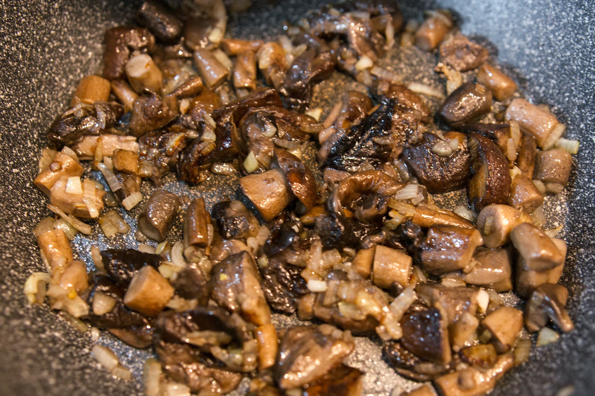 Несмотря на жидкость от грибов, жара было достаточно, чтобы в течение 10 минут именно обжарить, а не потушить продукты.