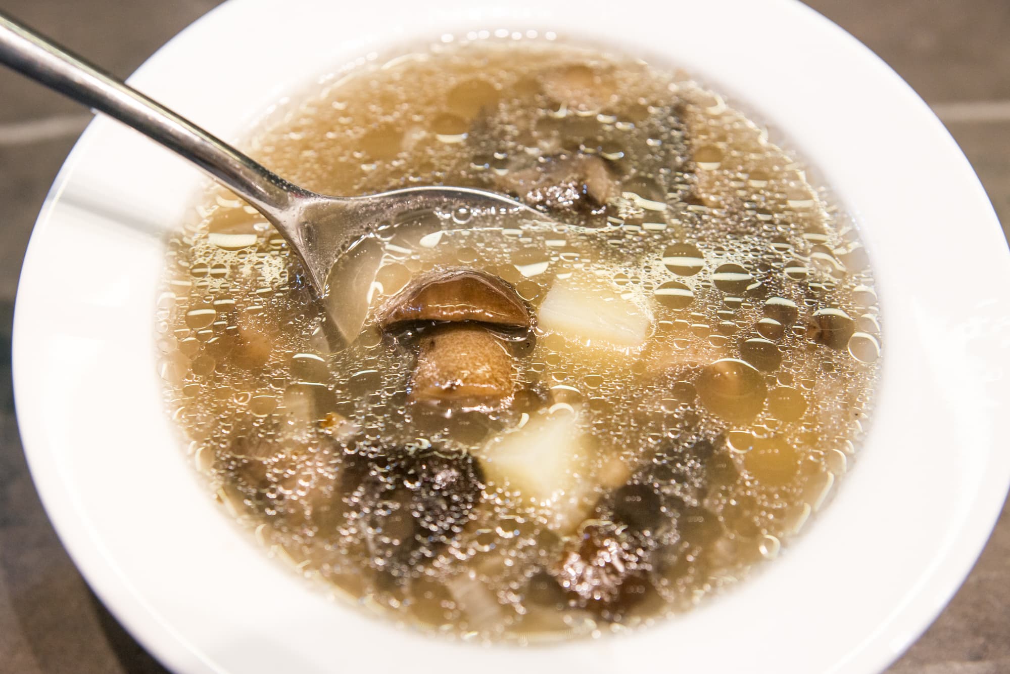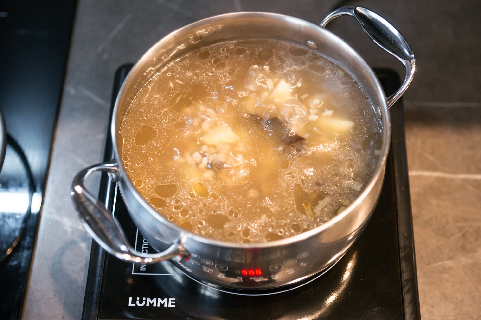 Опустили в бульон термометр и стали следить за температурой. Она постепенно опустилась до 85 °C, дальше пару минут плавно росла до 92 °C, а затем так же плавно падала до 85 °C, и так по кругу. За пределы этого диапазона температура не уходила. Нас это вполне устроило, и больше мы мощность не меняли. Бульон получился насыщенным и прозрачным. Мы его процедили, убрали мясо и на время отставили кастрюлю в сторону.