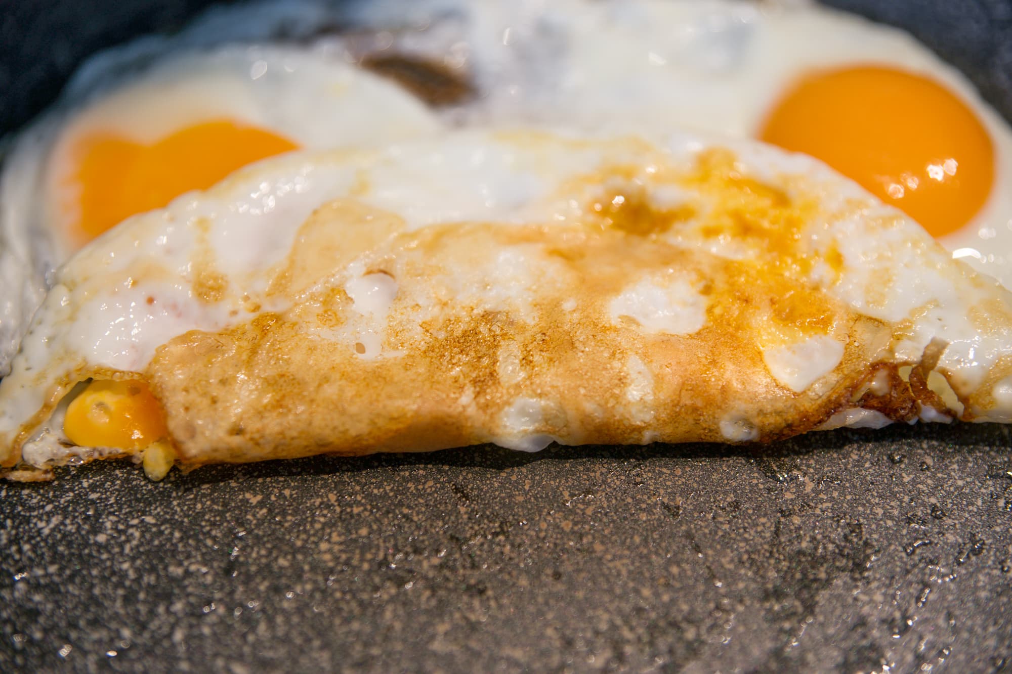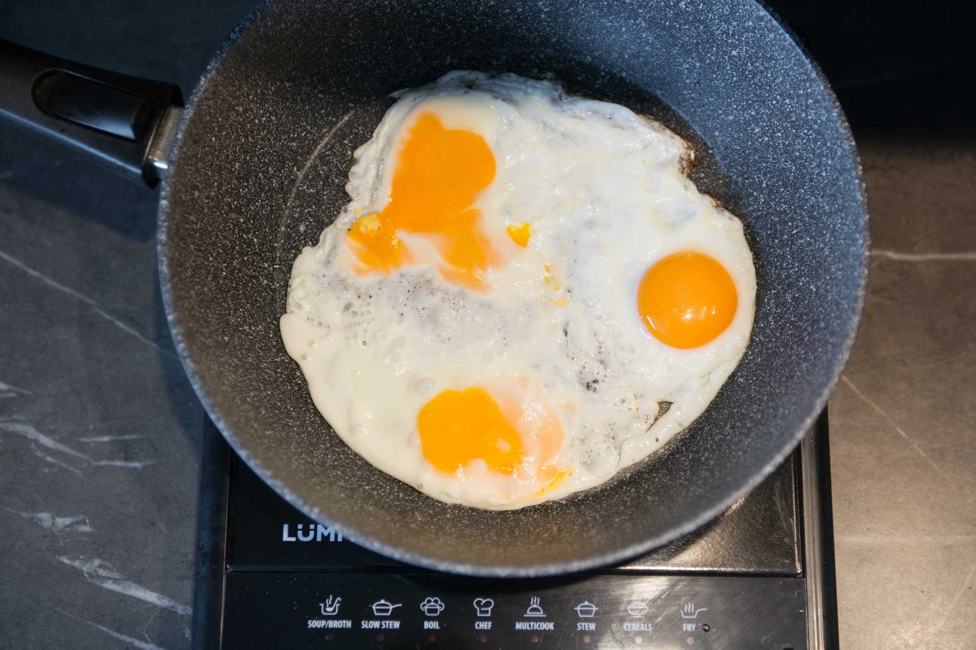 Ровно за 5 минут обжаривания при 240 °C белок хорошо схватился, но сохранил мягкость, а желток (тот, что не растекся при разбивании) остался жидким.