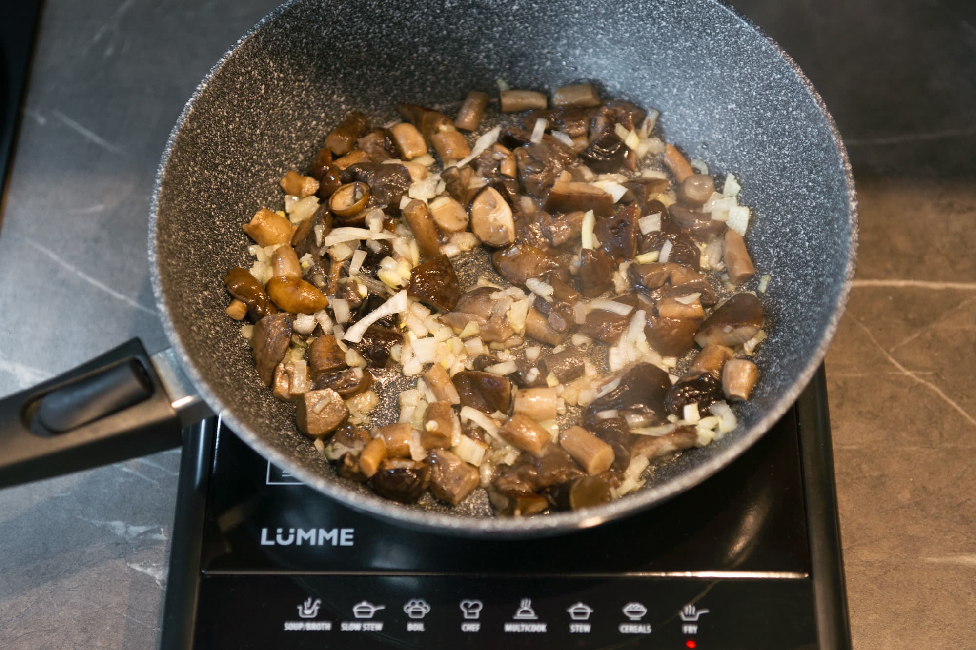 Предварительно отваренные грибы и лук быстро обжарили на сковороде в режиме Жарка при максимальных 270 °C.
