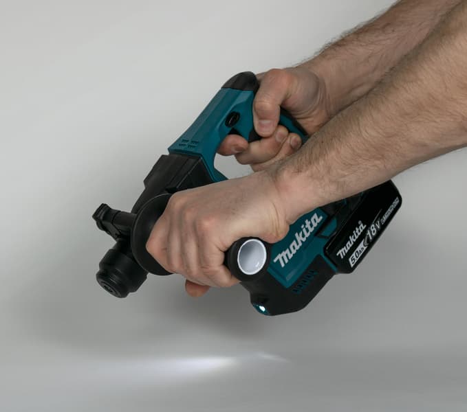 Рассматриваемый перфоратор — одна из самых простых моделей в линейке Makita. Он снабжен бесщеточным двигателем с высоким КПД, но мощность его не настолько велика, чтобы дополнять перфоратор антивибрационной системой. Такие системы устанавливаются только на мощные модели перфораторов. Они представляют собой амортизирующее устройство — противовес с пружиной, который принимает на себя отдачу. Принцип его работы тот же, что у компенсационных противовесов в небоскребах.