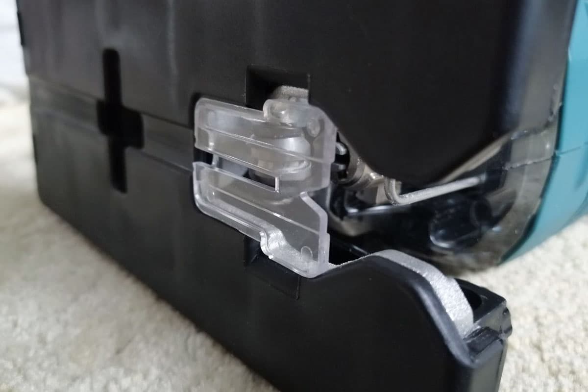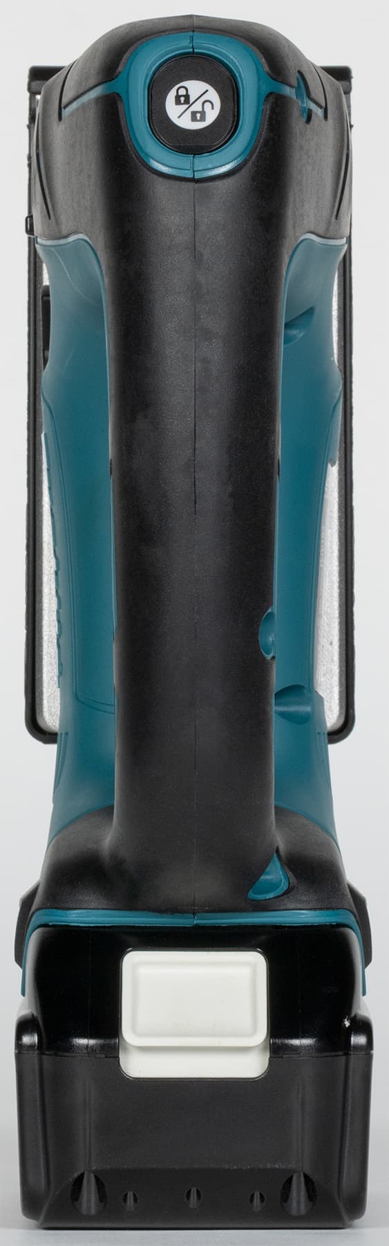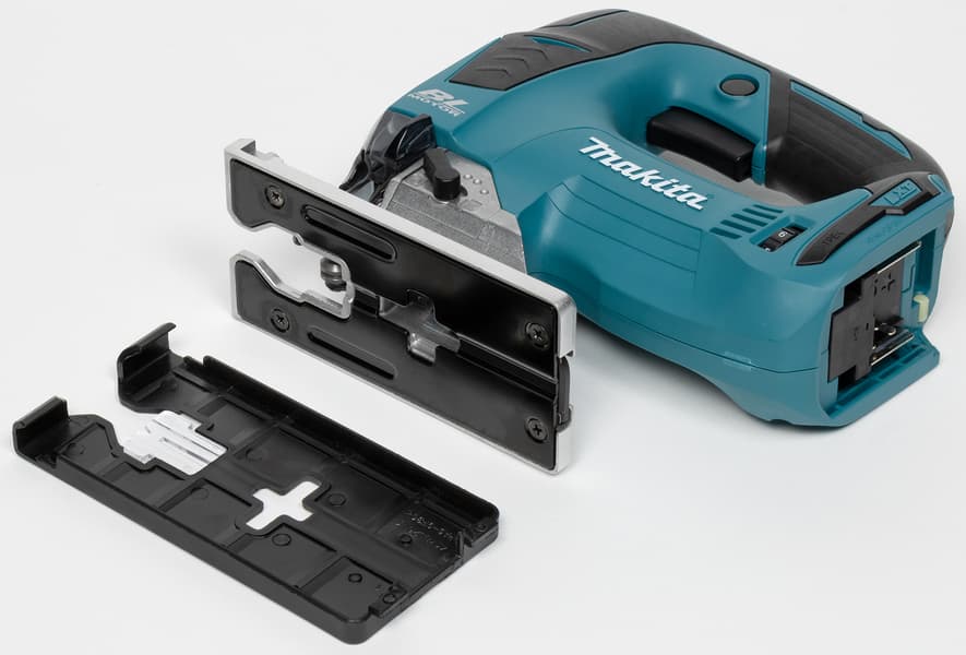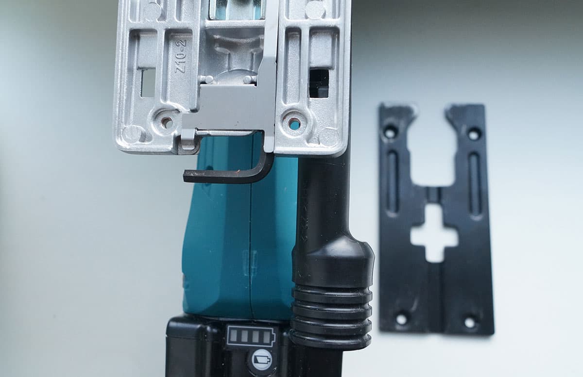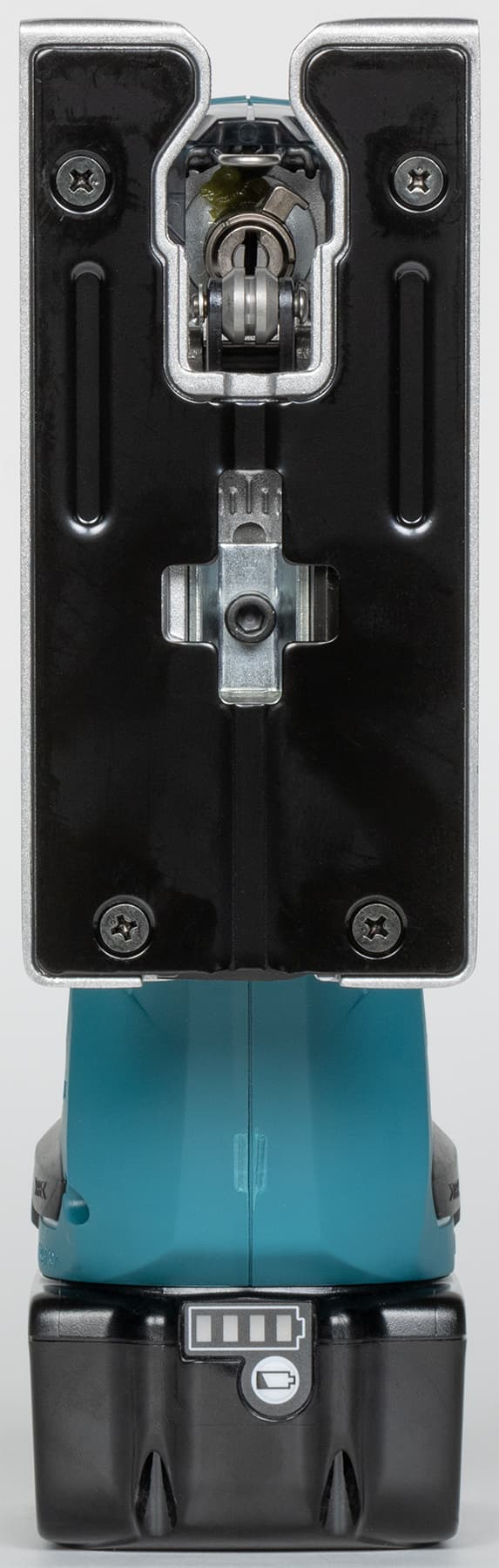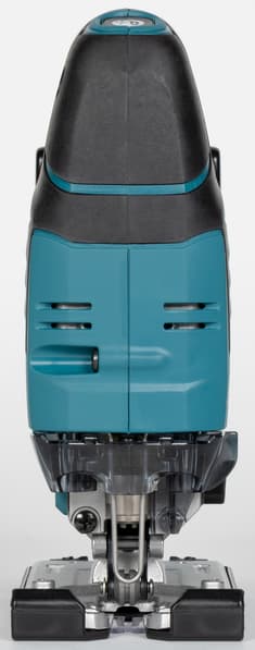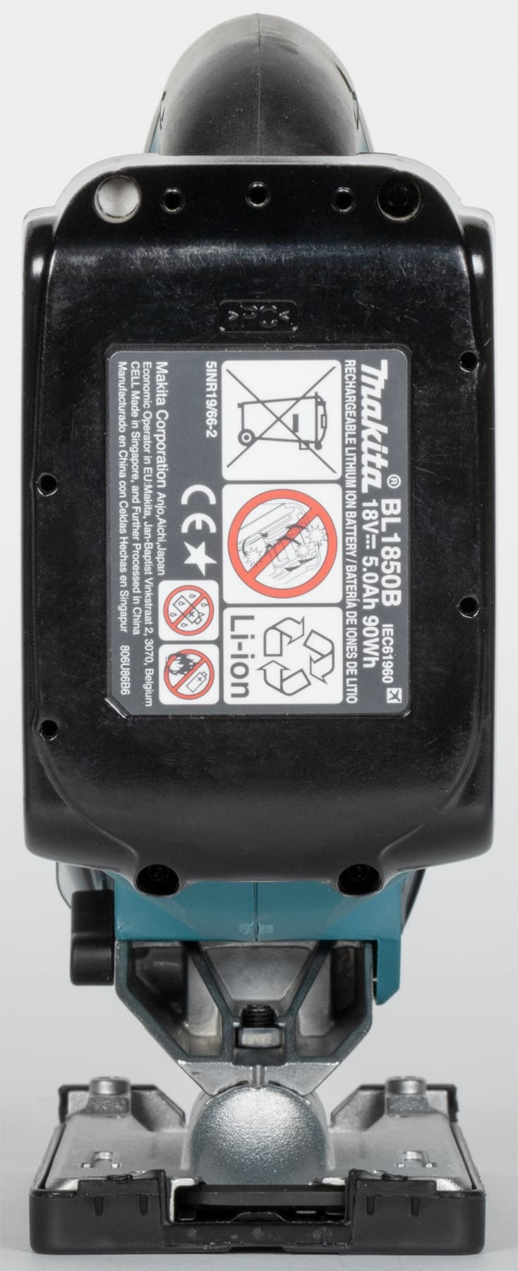 В случае с аккумуляторным инструментом разработчику оставалось лишь придумать, как бы поудачнее разместить батарею. У лобзика нет другого свободного места, кроме тыльной части корпуса. Все логично.