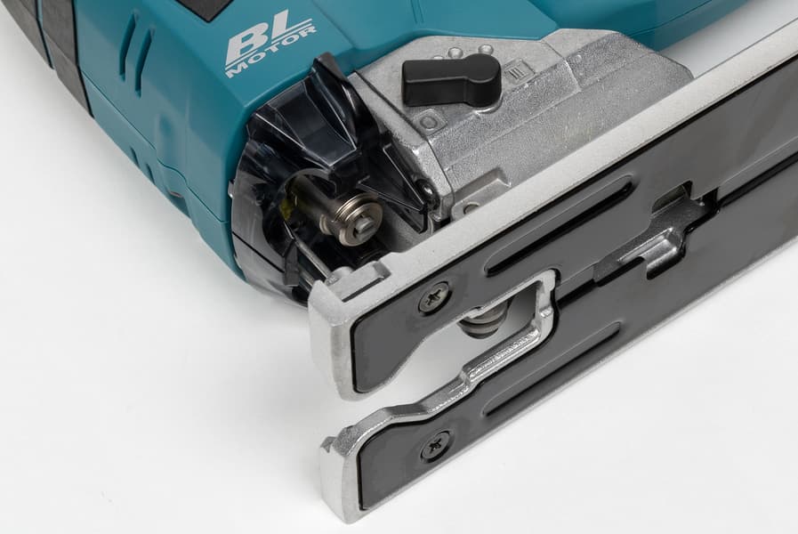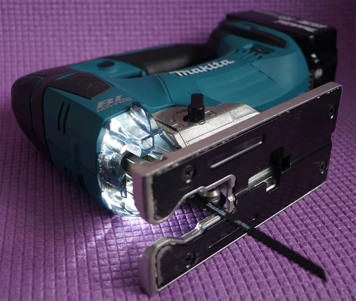 Еще одна приятность инструмента: встроенная светодиодная подсветка рабочей зоны. Она обеспечивается двумя белыми светодиодами, которые автоматически включаются при нажатии кнопки разблокировки и продолжают светиться, пока работает инструмент. В режиме ожидания светодиоды гаснут через 10 секунд простоя лобзика. Подсветку можно отключить принудительно, еще раз нажав кнопку блокировки, пока лобзик находится в режиме ожидания.