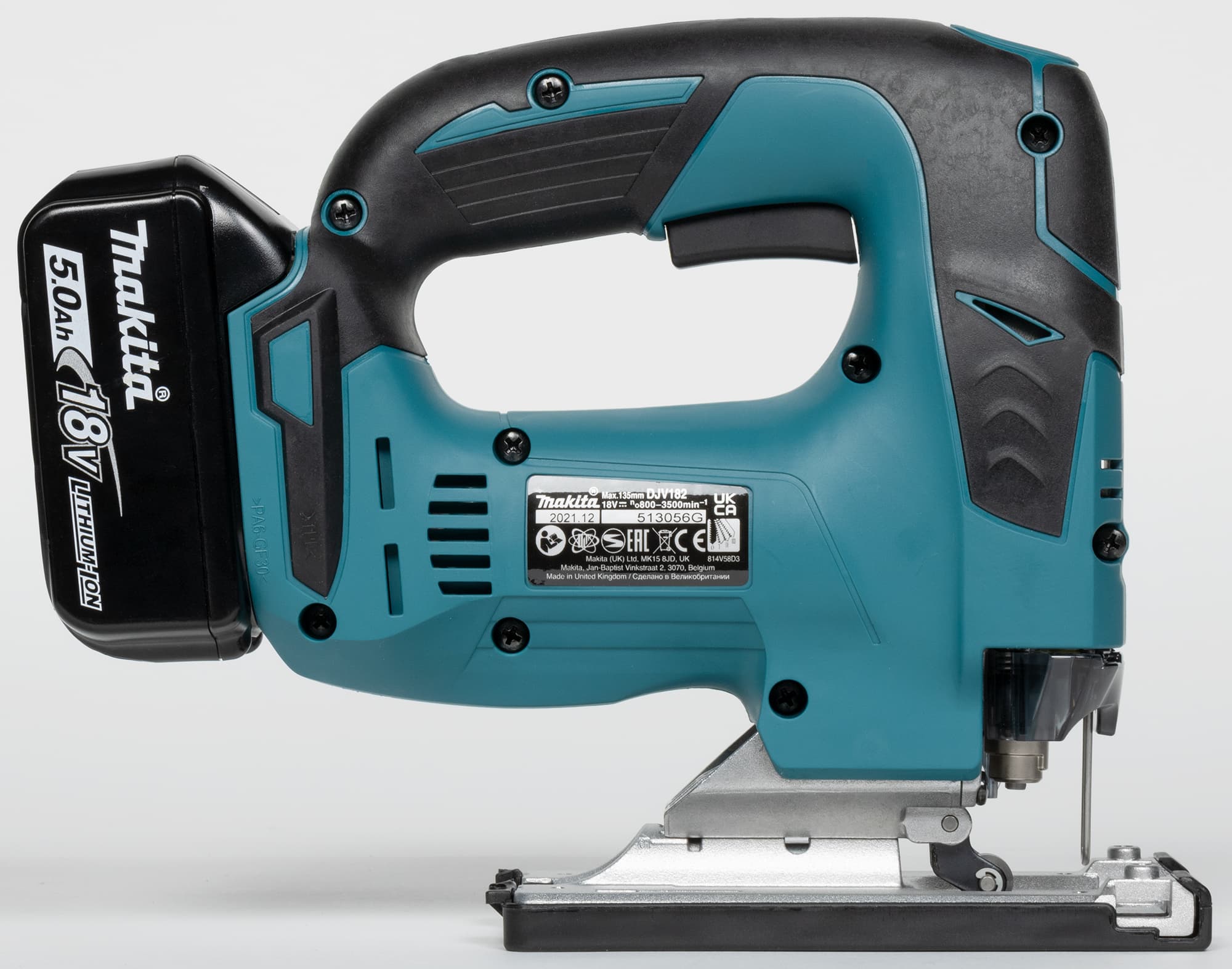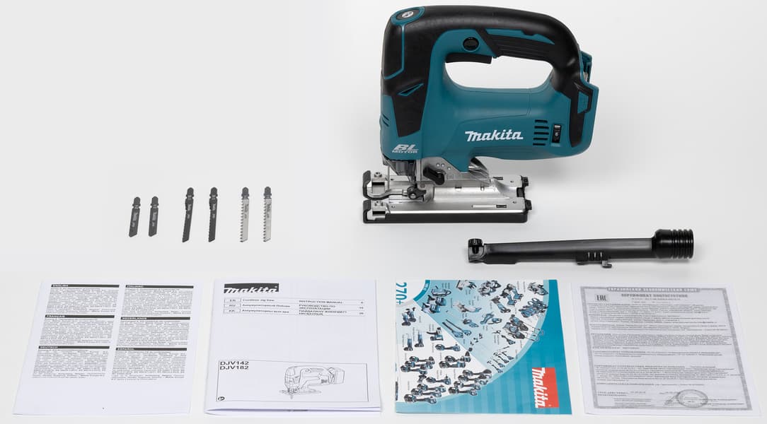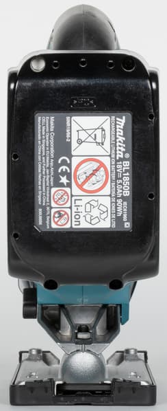 Аккумулятора в комплекте с лобзиком не оказалось. Это объясняется серьезной стоимостью батарей, комплект которых вместе с зарядной станцией стоит дороже, чем любой инструмент. Вторая причина кроется в том, что этот лобзик явно предназначен для тех домашних мастеров, у которых уже имеется какой-либо аккумуляторный инструмент Makita. Причем работающий именно от такого типа батарей, 18-вольтовых.