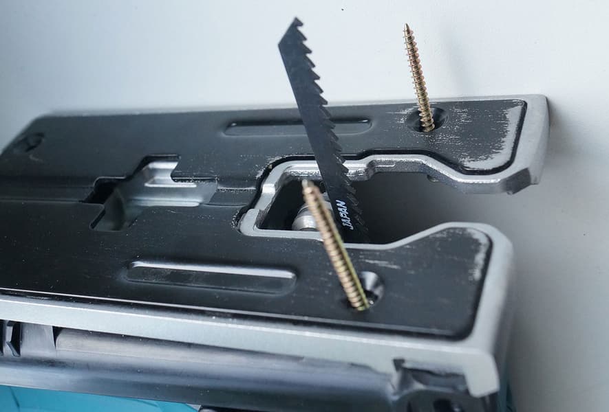Правда, свободное пиление в произвольных направлениях в таком случае представить сложно. Скорее всего, эта насадка пригодится при стационарном варианте использования лобзика. Такой способ эксплуатации инструмента в руководстве не упомянут ни словом, и это странно. Ведь ничего не мешает освободить подошву от штатных болтов и закрепить лобзик на верстаке вверх пилкой, прикрутив его болтами или саморезами. Главное — подобрать тонкие болты или саморезы, диаметром не больше 3 мм.