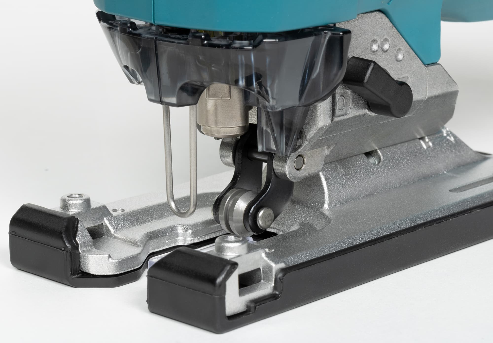 Нужно ли рассказывать о плюсах такого решения? Любой, кто хотя бы раз работал электролобзиком, с легкостью представляет преимущества плавного пуска. Такая функция дает возможность начать точный рез в нужном месте, плавно вгрызться в материал. Также плавный пуск предохранит от поломки режущего полотна, если в момент пуска оно зажато в разрезаемом материале.