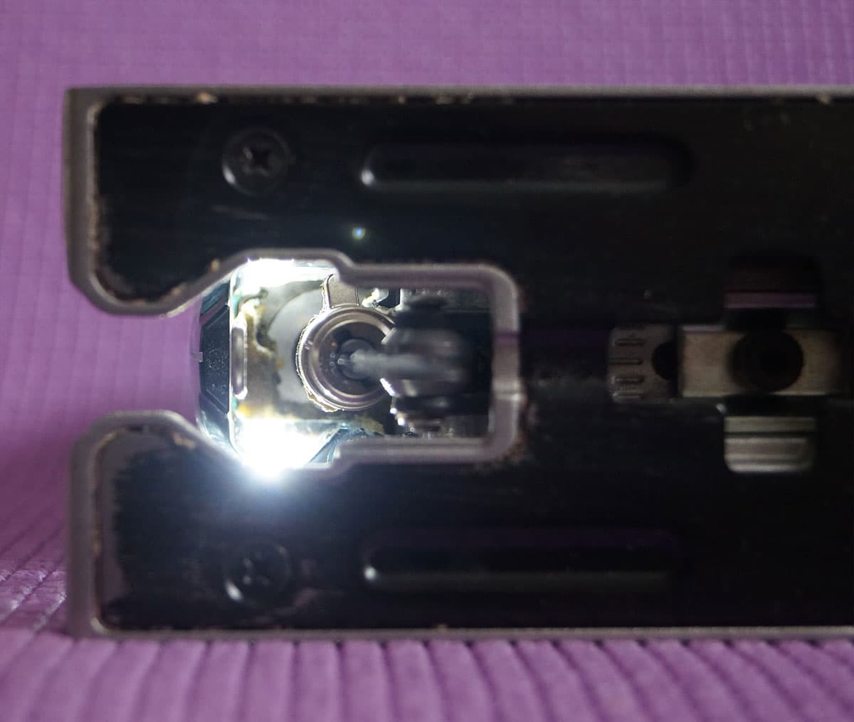 Его нетрудно вытянуть из углубления, подцепив пальцем. А чтобы ключ не выскочил из-за вибраций, тут используется металлическая пластинка, которая не только прижимает ключ в углублении, но и удерживает его загнутым язычком. Для того, чтобы ее увидеть, нужно отвинтить накладку подошвы. Она удерживается четырьмя короткими болтами.