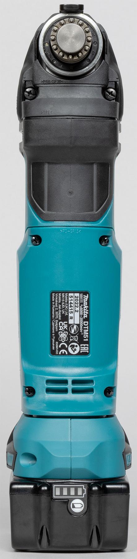 Да, выглядит точь-в-точь как «болгарка». Такой же продолговатый корпус и верхнее расположение основного органа (шпинделя) — сбоку и с краю. Даже ползунковый переключатель, запускающий двигатель, напоминает «болгарочный».