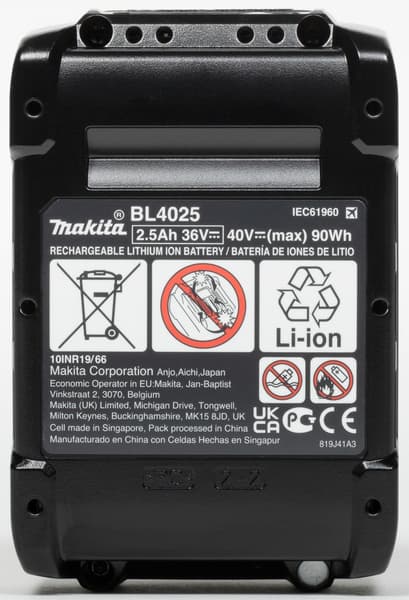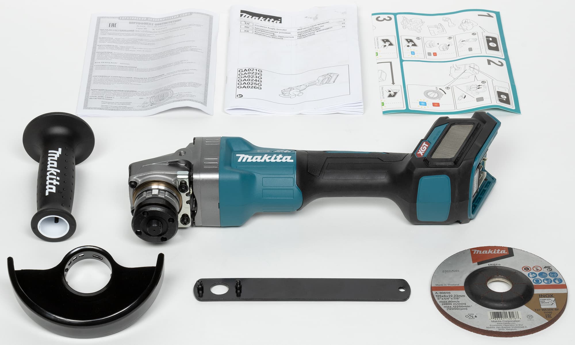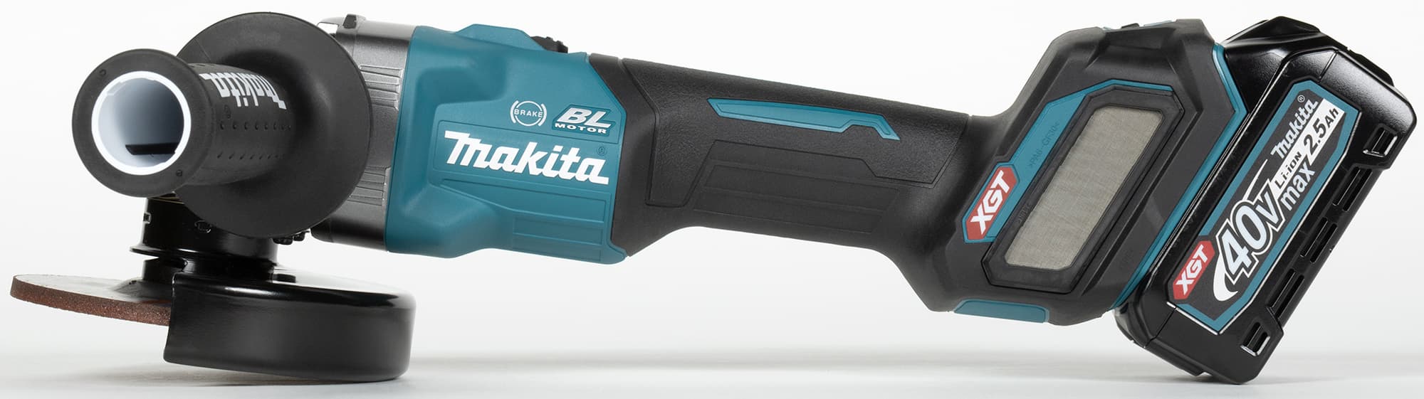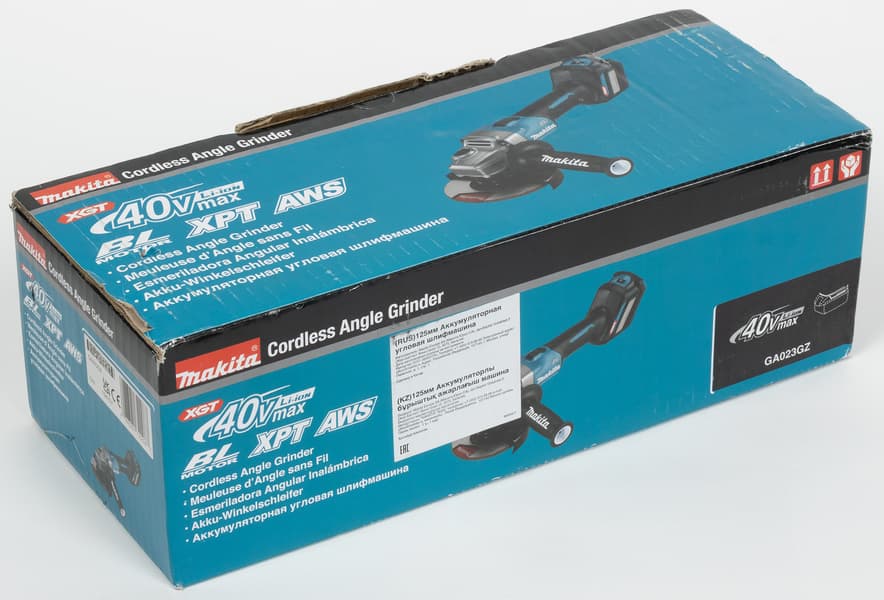 УШМ Makita GA023GZ питается от батарей Makita type с вольтажом 40 В. Производитель предлагает батареи разной емкости, от от 2 до 8 А·ч. Для тестирования болгарки была предоставлена батарея скромной емкости, 2,5 А·ч.