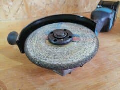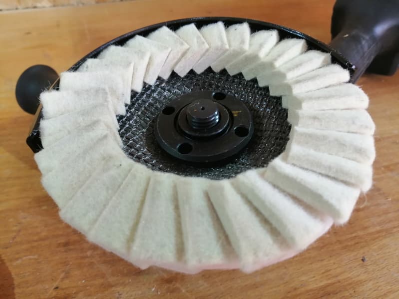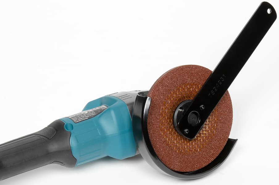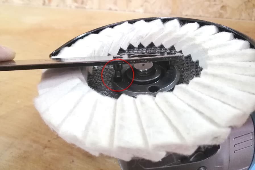 Помимо большого диаметра, кожух также имеет солидную высоту бортиков, аж 30 мм. Из-за такой высоты борта, орудовать прилагаемым ключом можно только в открытой зоне, вне кожуха. Кстати, ключ имеет плоскую форму, из-за чего некоторые типы насадок почти невозможно зафиксировать. Например, сантиметровая высота войлочных лепестков в этой насадке затрудняет затягивание гайки.