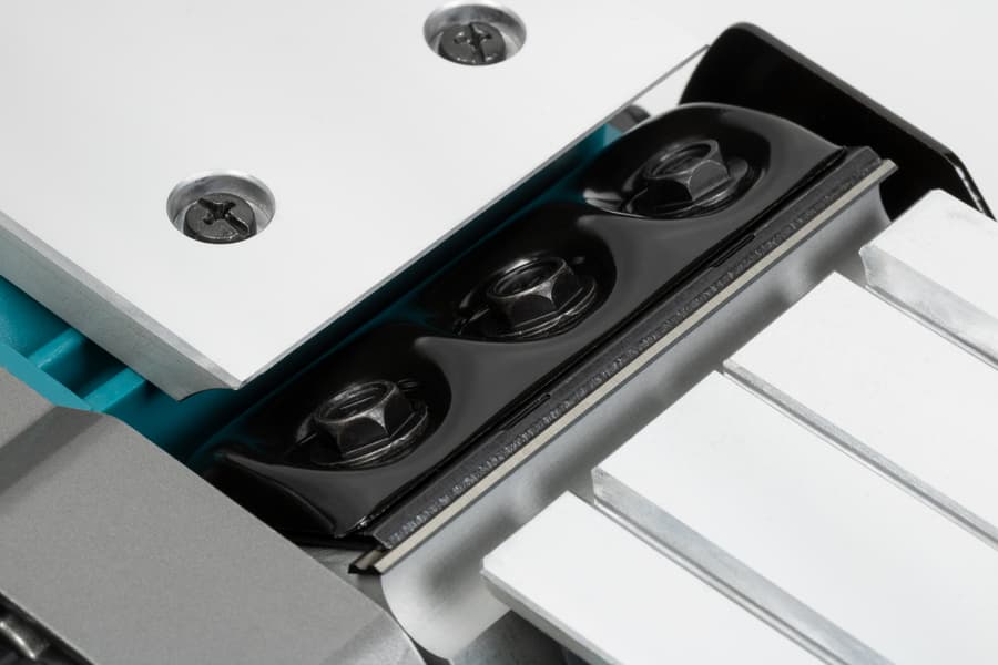 Комплект поставки содержит минимально необходимый набор аксессуаров: направляющая линейка (конструкция из блестящего металла с винтом), направляющая глубины (черный металлический уголок с прорезью и барашковым винтом), пластиковый держатель для заточки ножей и документация.