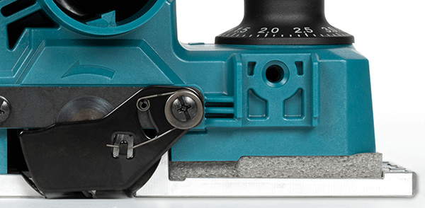 Впрочем, рассматриваемый рубанок все же имеет некоторые особенности, выгодно отличающие инструмент от прочих. Речь о безопасности. Точнее, о способах и приспособлениях, которые повышают безопасность работы. Например, такое на удивление элементарное, но действенное приспособление: подпружиненный язычок-опора. Если во время работы вы подняли рубанок над обрабатываемой поверхностью, то обратно рубанок встанет на поверхность не всей подошвой с ножами, а упрется в отскочившую опору. Это исключает риск повреждения ножей и заготовки. Лишь когда вы начнете движение рубанком, опора зайдет обратно внутрь задней части подошвы, и ножи войдут в контакт с древесиной плавно, а не рывком.