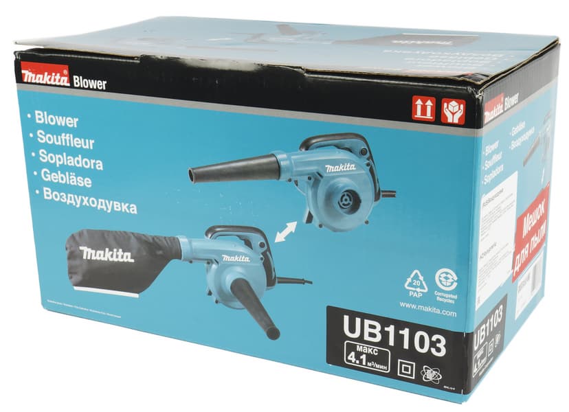 Многофункциональное устройство воздуходувка/пылесос Makita UB1103 было доставлено на тесты в картонной коробке, оформленной в фирменной стилистике Makita. Благодаря привычной зелено-голубой цветовой гамме продукцию компании легко узнать не только на полках магазинов, но и в режиме реальной эксплуатации. Стоит только бросить беглый взгляд.