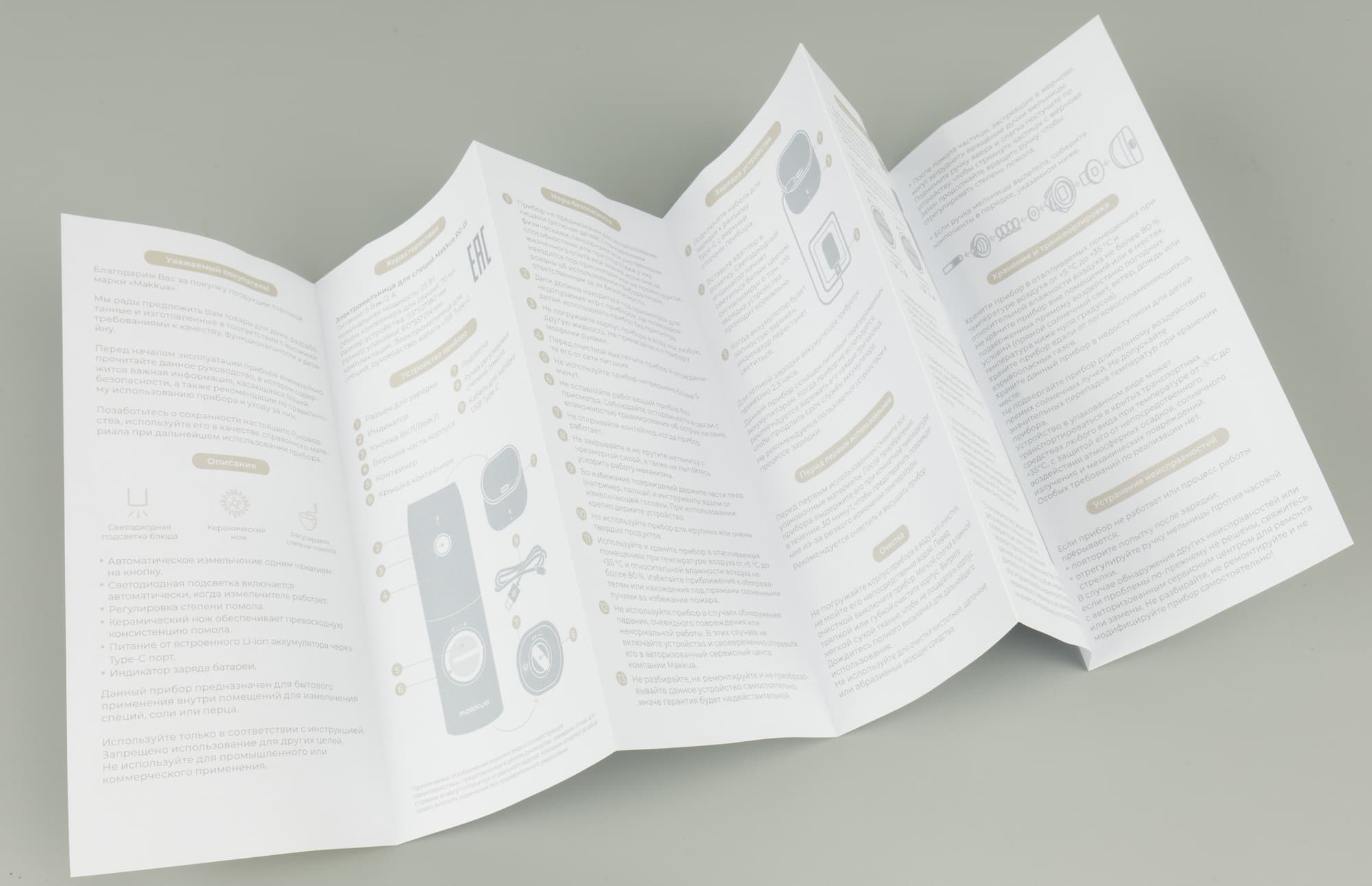 Инструкция для Makkua Spices series RG-01 представлена в виде небольшого буклета на русском языке. В тексте руководства подробно представлена вся необходимая информация о приборе, а некоторые разделы дополнены иллюстрациями.