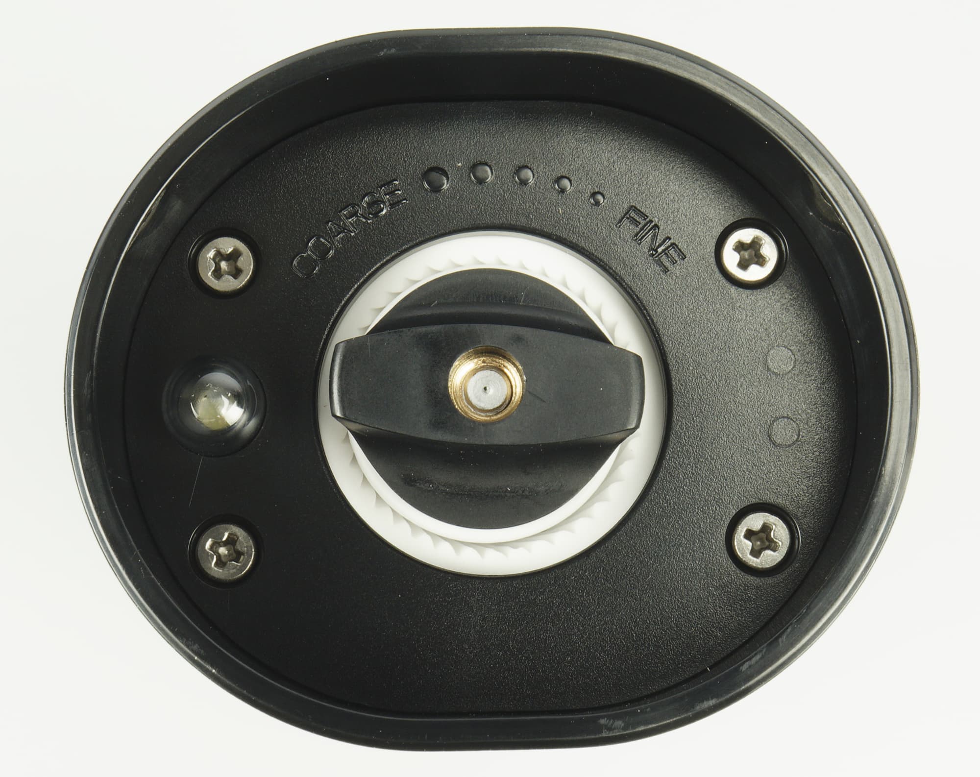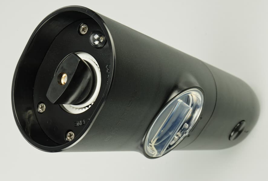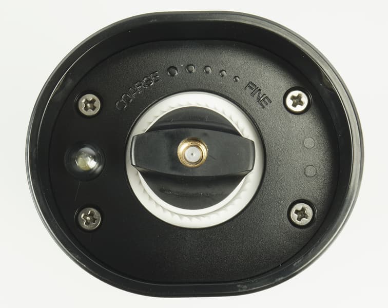 В основании прибора — керамические жернова и ручка, отвечающая за регулировку степени помола от Course (Грубый помол) до Fine (Мелкий). Рядом есть небольшой фонарик, который освещает область под мельницей при использовании.