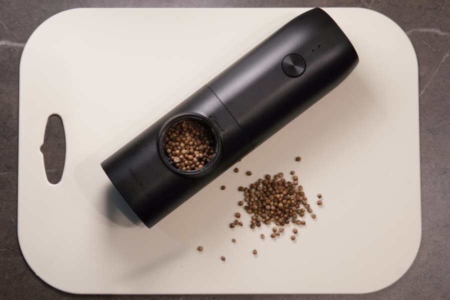 Мельница — устройство элементарное, поэтому ожидаемо ни с какими трудностями в процессе эксплуатации мы не столкнулись. Кнопка включения нажимается легко, имеет ощутимый ход, срабатывает четко. Если сравнить электрическую мельницу с обычной механической, в удобстве конечно выигрывает первая. Всё же пользоваться одной рукой при измельчении продуктов куда комфортнее: непродолжительное нажатие на кнопку, и на блюдо аккуратно высыпается порция свежемолотых специй. В процессе светодиод подсвечивает блюдо, что оказалось совсем нелишним, особенно если над кухонной столешницей недостаточно освещения или прием пищи происходит в полумраке.