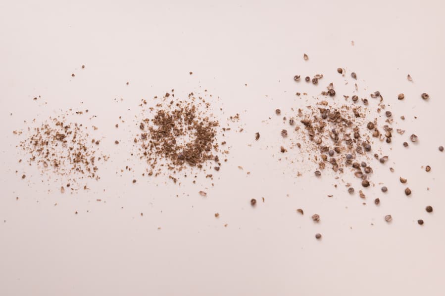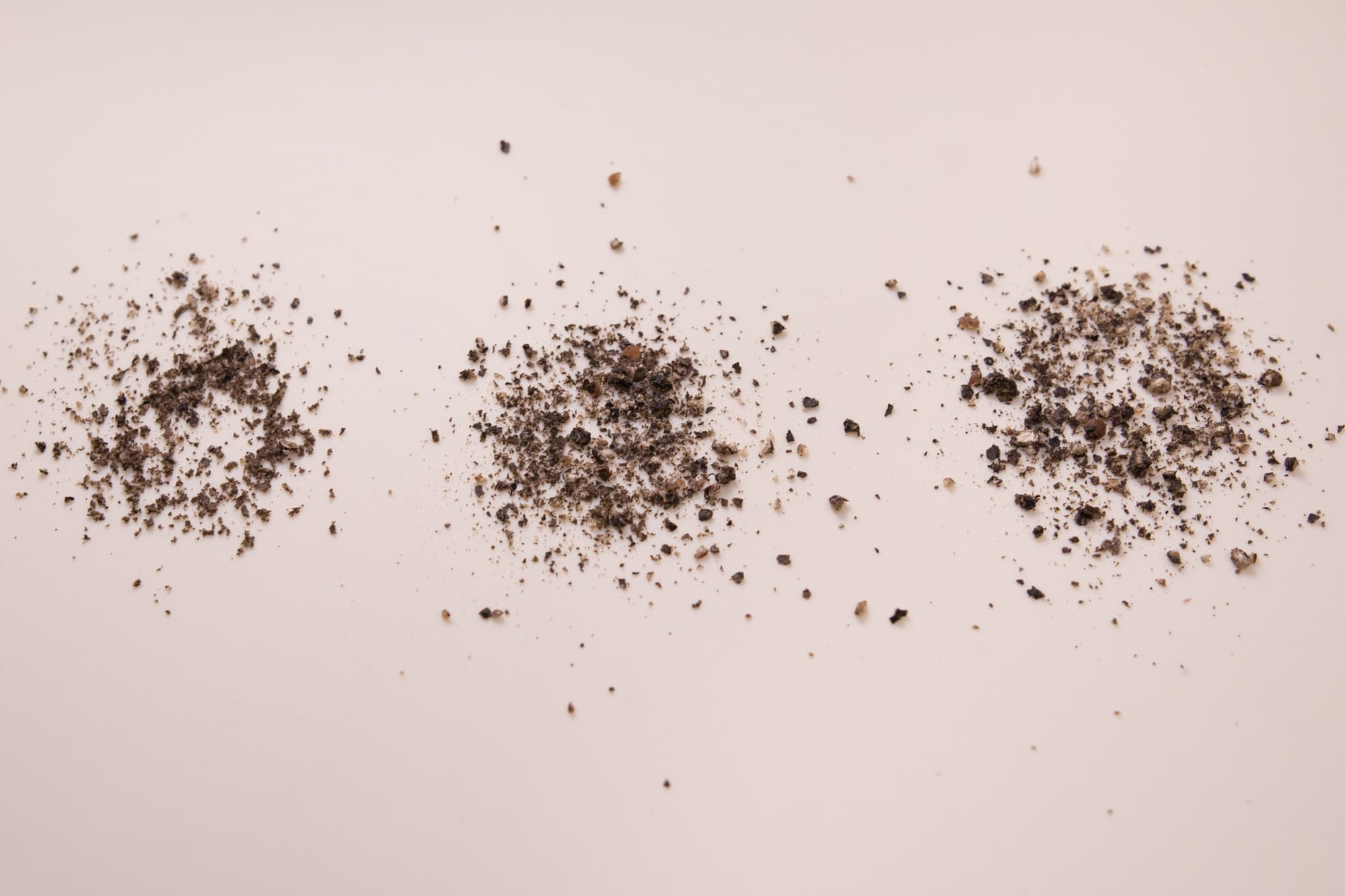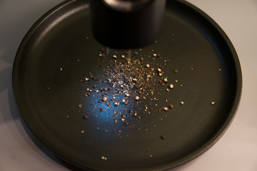 Мельница жужжала, но ни единой крошки так и не выпало — горошины диаметром 8-10 мм оказались ей не под силу. Со стандартным мелким перцем (3-5 мм) мы получили следующий результат:
