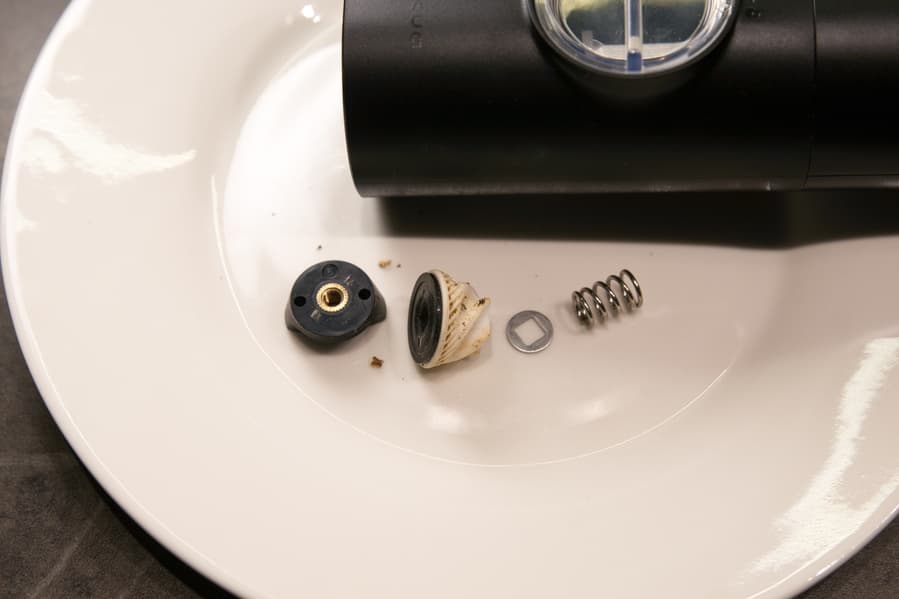 Для очистки керамического ножа ручку-регулятор степени помола придется полностью открутить и вытащить всю измельчающую конструкцию.