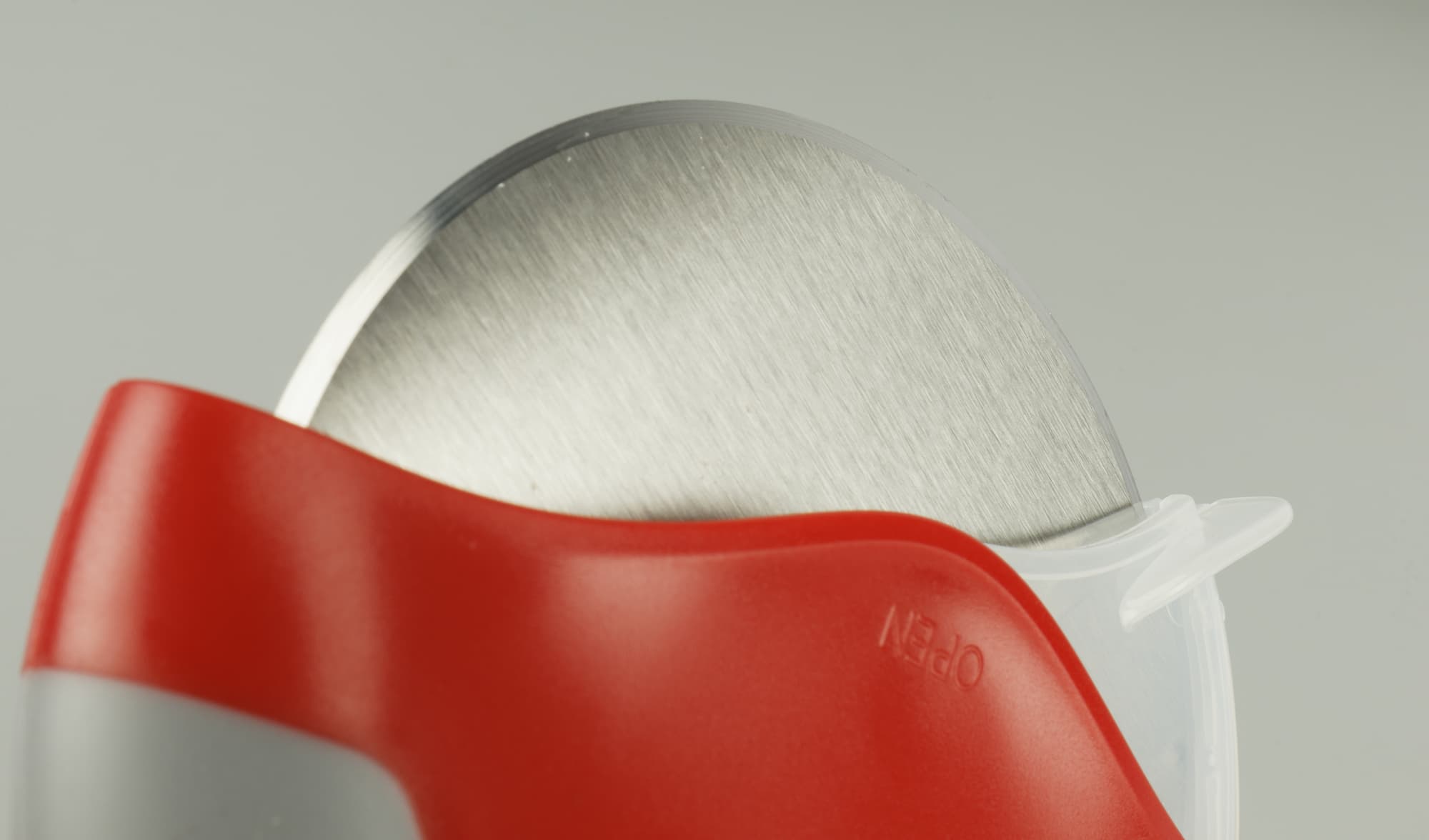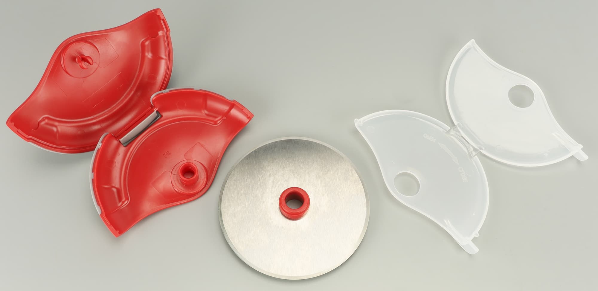 Прозрачная часть футляра также защелкивается и закрывает острые края ножа при хранении. Режущая часть при раскрытом футляре составляет 9,5×3,5 см. Нож в процессе резки свободно крутится вокруг своей оси.