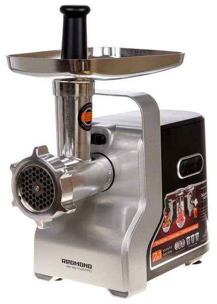Redmond RMG-1230-7 позиционируется как многофункциональное устройство 7 в 1, совмещающее в себе мясорубку, соковыжималку и овощерезку. При этом прибор снабжен функцией плавного пуска, двойной защитой (от перегрева и от перегрузки) и солидным набором аксессуаров.