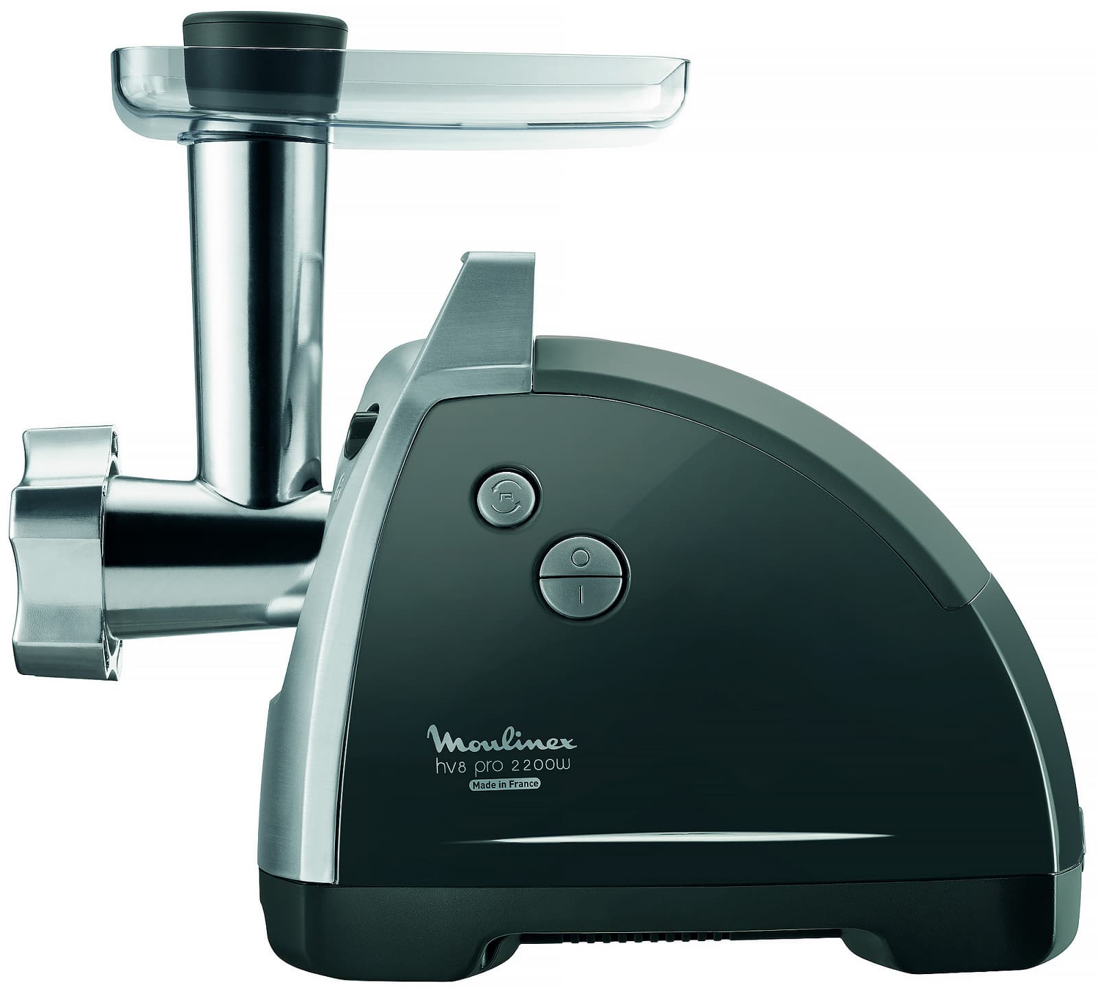 Moulinex HV8 Pro ME687832 относится к категории многофункциональных устройств. Помимо стандартных насадок для изготовления колбасок и кеббе, она оснащена овощерезкой с тремя конусами. Прибор также отличает высокая мощность, необычная форма насадки-мясорубки и наличие отсека для хранения аксессуаров. В комплект к прибору входят две стальные решетки: одна со средним с диаметром отверстий (4,5 мм), другая с крупными отверстиями (8 мм).