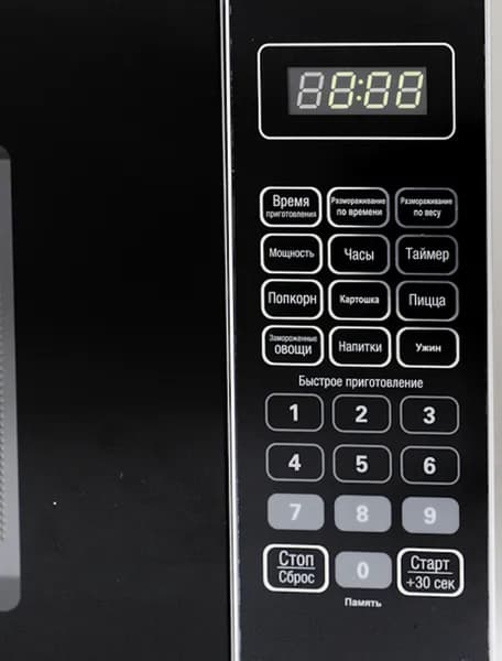 Самое простое — электромеханическое с поворотными переключателями или элементарное кнопочное — встречаются у моделей с минимумом программ и функций. То и другое достаточно удобно, но поворотные переключатели проще, а в кнопках надо немного разобраться, хотя в этом случае всегда есть удобные так называемые быстрые кнопки (например, увеличения мощности, прибавления 30 секунд к времени приготовления — очень удобно для разогрева). В некоторых моделях можно встретить комбинацию «кнопки + поворотные регуляторы», и разобраться в таком управлении для неискушенного пользователя иногда сложновато.