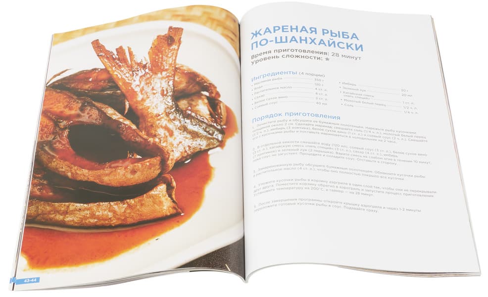 Также к устройству прилагается цветная увесистая книга с рецептами формата А4, напечатанная на плотной глянцевой бумаге. Она оказалась красочной, с интересными рецептами, подробными описаниями необходимых ингредиентов, этапами приготовления и фотографиями готовых блюд.