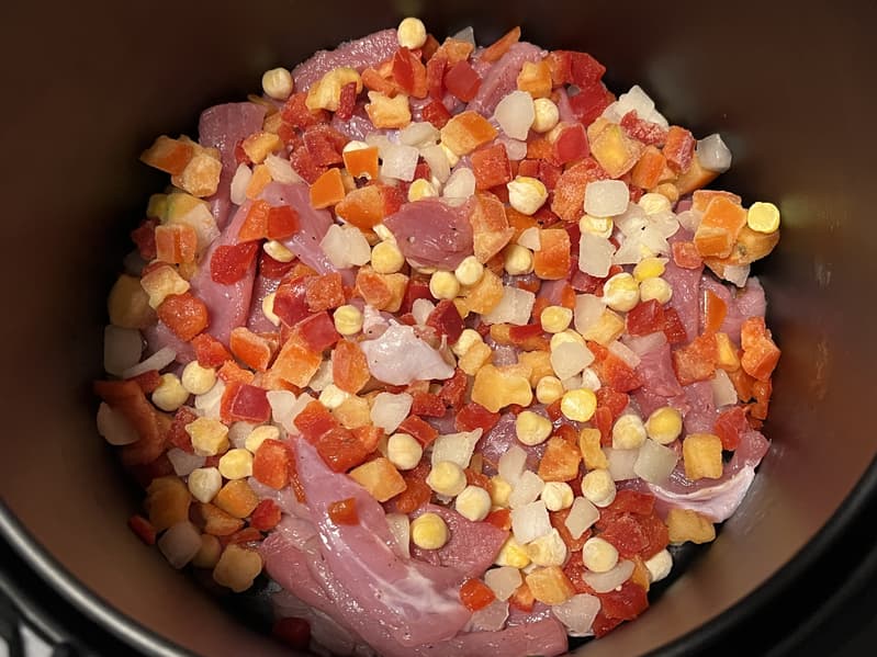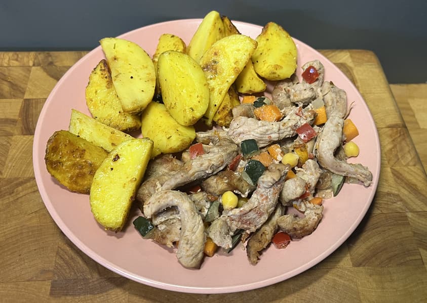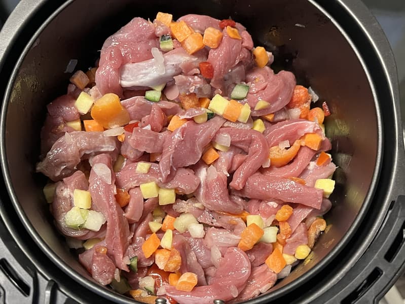 Чтобы проверить, насколько хорошо в аэрогриле прожарится большое количество мяса, мы решили приготовить в нем свинину с овощами.
