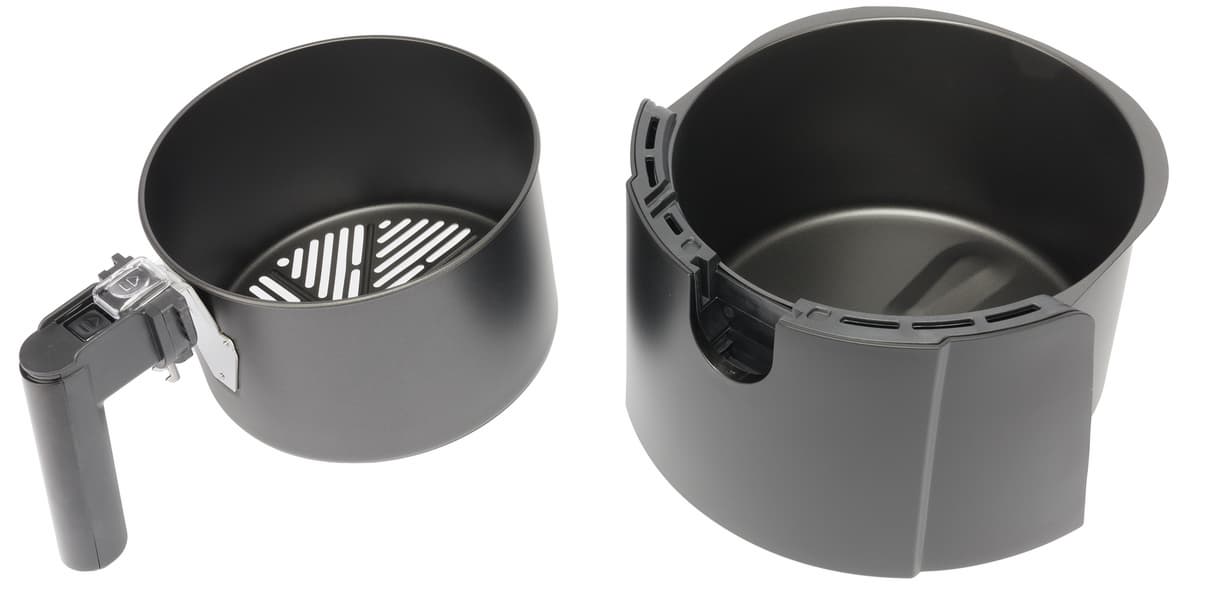 Из приятного: аэрогриль занимает немного места на рабочей поверхности и требует минимального ухода как снаружи, так и внутри. Все брызги и жир не попадают наружу, и можно не бояться, что в процессе приготовления запачкаются соседние приборы или посуда. После использования аэрогриля останется только помыть емкости, протереть нагревательный элемент (лучше и быстрее всего загрязнения с него удаляются бумажным полотенцем) и смахнуть пыль с корпуса.