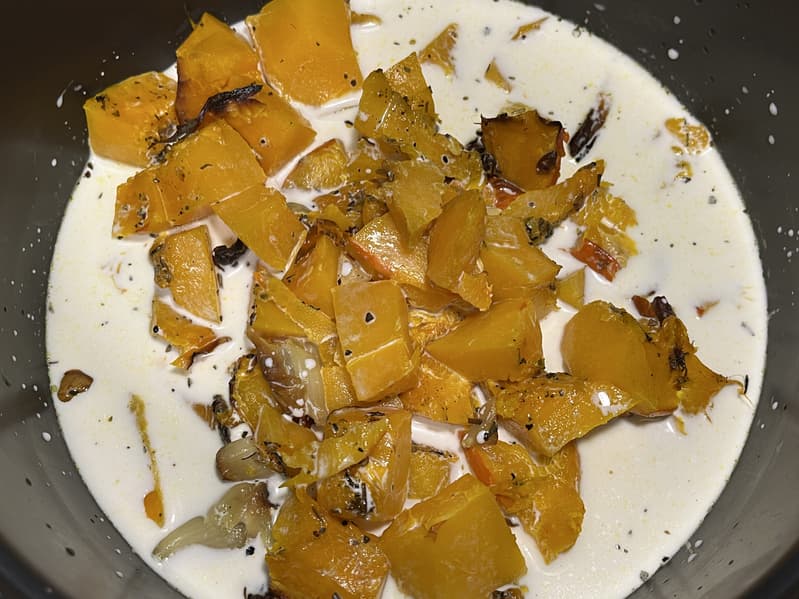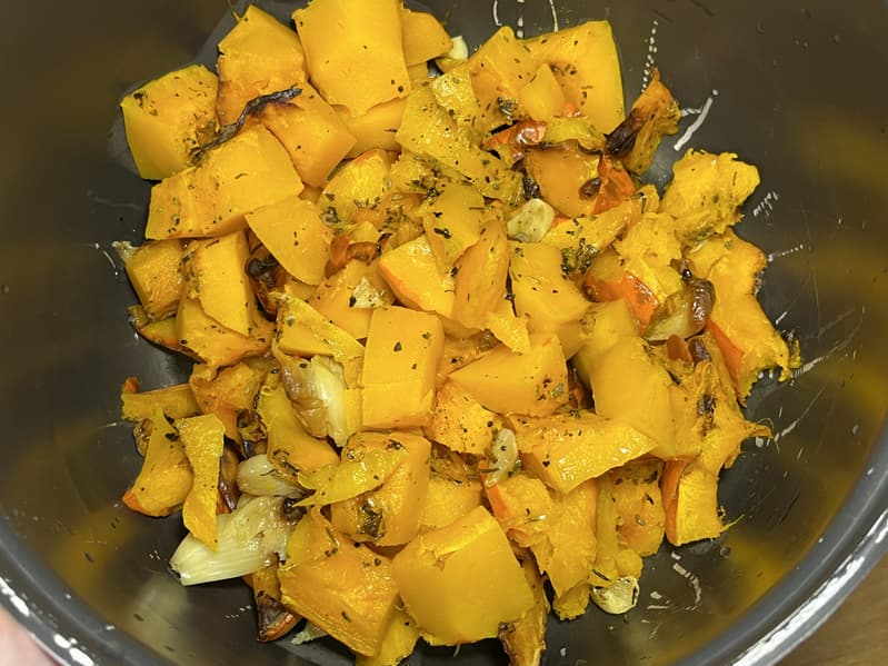 После того как тыква немного подостыла, мы срезали кожуру и порезали ее на небольшие кусочки. Чеснок выдавили из шелухи и добавили к тыкве. Сверху налили сливки и приступили к блендированию.