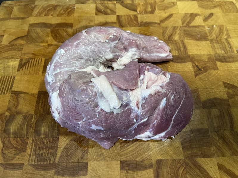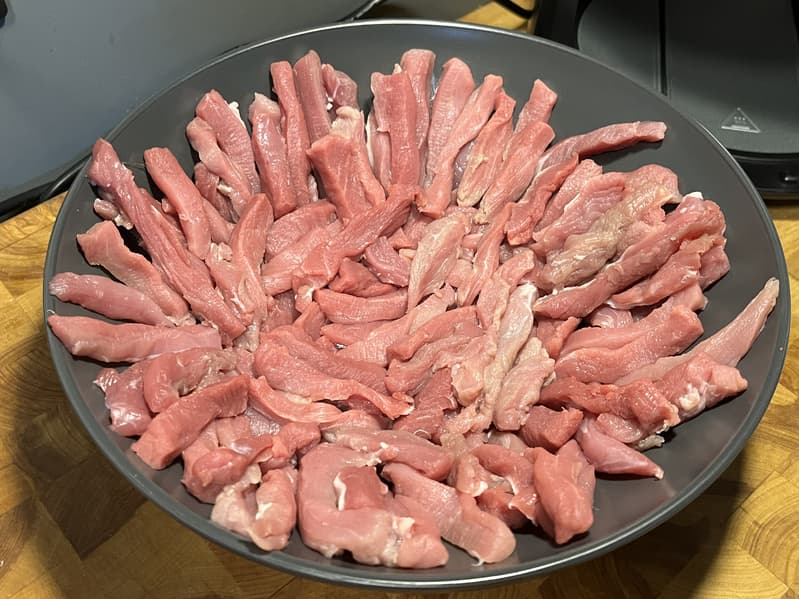 Взяли мякоть весом 1,3 кг, отделили от нее сухожилия и нарезали ее на короткие полоски.