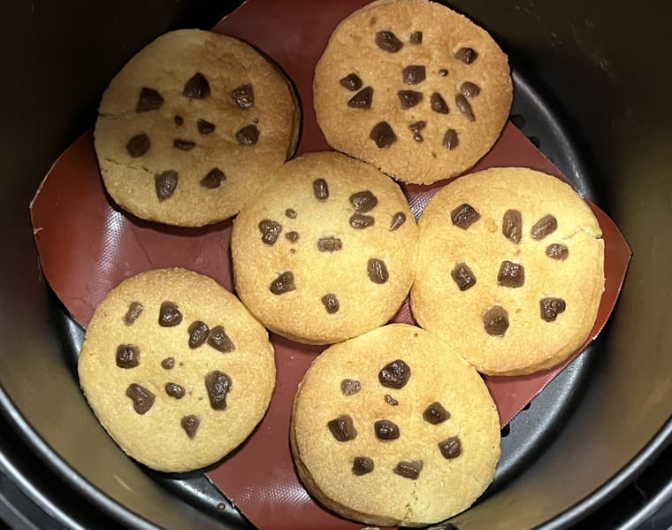 Несмотря на то что мы закрыли бо́льшую часть отверстий для циркуляции горячего воздуха под решеткой, печенье всё равно отлично пропеклось за счет зазора между контейнером и поддоном, а сверху тэн еще и здорово его подрумянил.