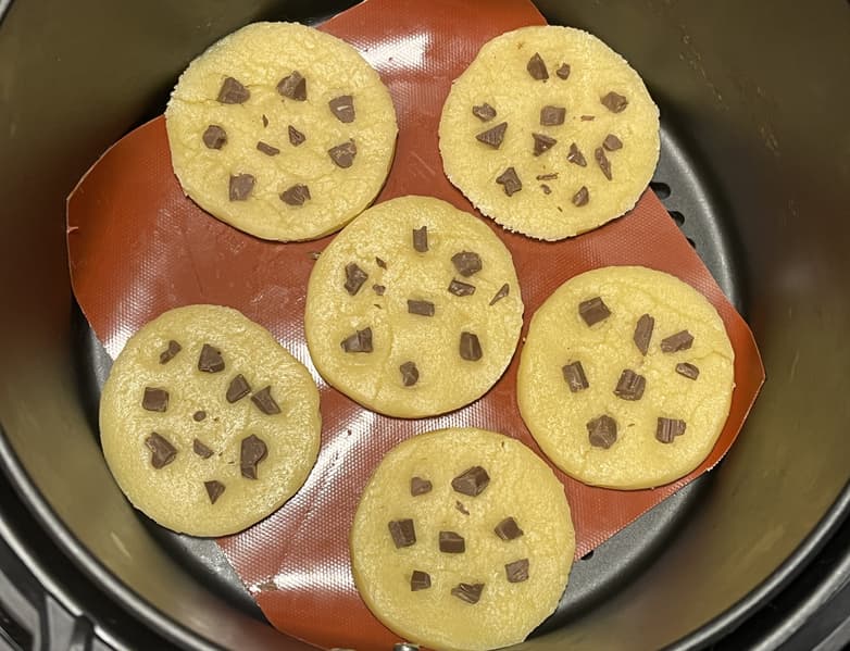 Украсили печенье шоколадом и уложили его в аэрогриль. Хотелось уложить выпечку без коврика, чтобы горячий воздух без труда попадал под решетку, пропекая печенье снизу, но после раскатки тесто стало слишком мягким и на голой решетке начинало продавливаться.