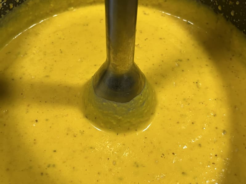 Когда блендер выполнил свою часть работы, мы подогрели суп на плите (но можно было этого и не делать, так как тыква сохранила достаточно тепла).